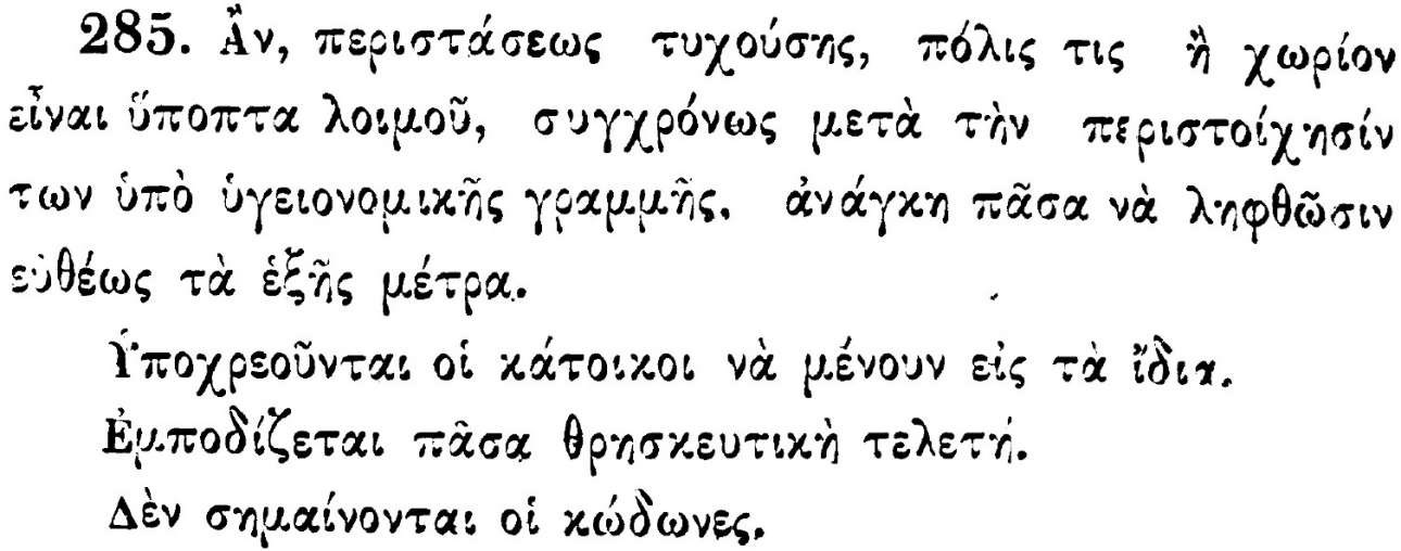 Ο Καποδίστριας θεωρούσε ότι τα πρώτα δύο μέτρα που έπρεπε να λάβει μια κυβέρνηση αμέσως μετά την εμφάνιση επιδημίας σε μια περιοχή είναι ο υποχρεωτικός εγκλεισμός στις οικίες όλων των κατοίκων και το κλείσιμο των εκκλησιών. Αυτό αποδεικνύεται με έναν από τους πρώτους νόμους που πέρασε ο ίδιος τον Αύγουστο του 1828, όταν πια η επιδημία βρισκόταν σε ύφεση. Στις 20 Αυγούστου του 1828 εξέδωσε Ψήφισμα «Περί υγειονομικών διατάξεων» (Ψηφ. 15/20.8.1828). Εκεί προβλέπεται το εξής στο άρθρο 285, εδ. 3. «Εμποδίζεται πάσα θρησκευτική τελετή. Δεν σημαίνονται οι κώδωνες.» Οι δε κάτοικοι υποχρεώνονται να μείνουν κλεισμένοι στα σπίτια τους. Σύμφωνα με τις γενικές διατάξεις του Ψηφίσματος, τα προληπτικά μέτρα εφαρμόζονται ΑΜΕΣΩΣ μόλις εμφανιστεί επιδημία στην Ελλάδα ή στα σύνορα της Ελλάδας. Το ψήφισμα υπογράφει ο ίδιος ο Κυβερνήτης («Ι.Α. Καποδίστριας»), καθώς και ο Γραμματέας της Επικράτειας («Σ. Τρικούπης»).