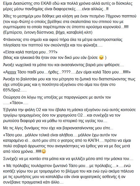 Μία άκρως συγκινητική και συνάμα ανατριχιαστική ιστορία που αντανακλά την ευαισθησία και την ανάγκη να έχουμε δίπλα μας τους αγαπημένους μας ανθρώπους αυτές σε αυτές τις δύσκολες στιγμές που περνάμε λόγω της κρίσης του κορονοϊού διηγείται με ανάρτησή του στο Facebook διασώστης του ΕΚΑΒ στη Θεσσαλονίκη.