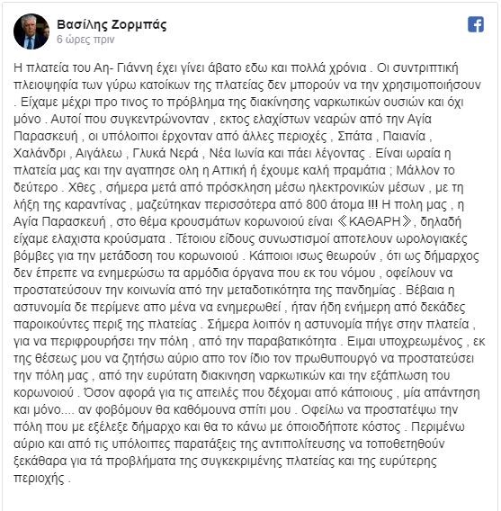 Πληροφορίες λένε πως δεν ήταν η πρώτη φορά που πλήθος νεαρών συγκεντρώνεται στην ίδια πλατεία. Ο δήμαρχος Αγίας Παρασκευής Βασίλης Ζορμπάς κάνει λόγο σε ανάρτησή του στο Facebook για προσκλήσεις που «μοιράστηκαν» με ηλεκτρονικό τρόπο επισημαίνοντας ότι «τέτοιου είδους συνωστισμοί αποτελούν ωρολογιακές βόμβες για την μετάδοση του κορονοϊού». Προαναγγέλλει, δε, ότι θα θέσει το θέμα στον Πρωθυπουργό επισημαίνοντας και το πρόβλημα της διακίνησης ναρκωτικών με ορμητήριο τη συγκεκριμένη πλατεία.