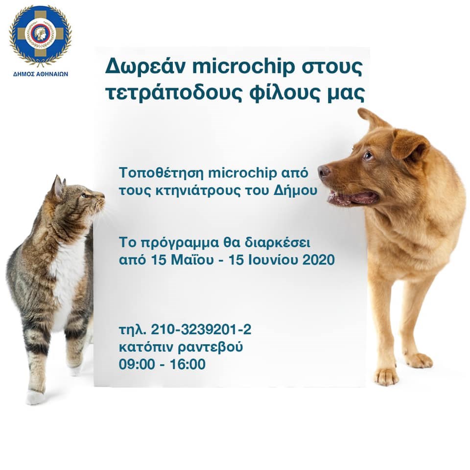Ένα πρόγραμμα που έχει στόχο να συμβάλει στον μέγιστο δυνατό βαθμό στην εξασφάλιση της ευζωίας για όλους τους τετράποδους φίλους μας, ξεκινά ο δήμος Αθηναίων. Πρόκειται για τη δωρεάν τοποθέτηση microchip και την καταχώρηση στη βάση δεδομένων του αρμόδιου υπουργείου Αγροτικής Ανάπτυξης των στοιχείων για όλους τους δεσποζόμενους σκύλους και γάτες των οποίων οι «κηδεμόνες» είναι κάτοικοι του δήμου Αθηναίων. Η ηλεκτρονική σήμανση των ζώων είναι υποχρεωτική βάσει του Ν.4039/2012 και η μη συμμόρφωση επιφέρει πρόστιμο ύψους 300 ευρώ. «Στον δήμο Αθηναίων αντιλαμβανόμενοι τις οικονομικές δυσκολίες που πολλοί δημότες και γενικότερα κάτοικοι της πόλης μπορεί να αντιμετωπίζουν -και λόγω της συγκυρίας που ενδεχομένως δεν τους επιτρέπει να ανταποκριθούν στις προβλέψεις του νόμου- αποφασίσαμε να σταθούμε αρωγοί σε όσους πραγματικά θέλουν το καλό των ζώων τους», τονίζεται σε ανακοίνωση του δήμου.