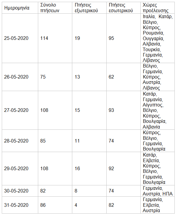 Ακολουθούν τα διαθέσιμα μέχρι στιγμής στοιχεία για την εβδομάδα από 25 έως 31-5-2020: