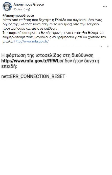 Όπως αναφέρουν σε σχετική ανάρτηση στα social media, επιτέθηκαν στην ιστοσελίδα του τουρκικού υπουργείου Εθνικής Αμύνης, την οποία έθεσαν εκτός λειτουργίας. “Θα θέλαμε να ενημερώσουμε τους μογγολους να ηρεμήσουν γιατί θα χάσουν την μπάλα”, προσθέτουν.