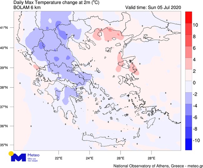 Οι βορειοδυτικοί άνεμοι στα πελάγη θα φτάνουν κατά τόπους τα 5-6 μποφόρ. Η θερμοκρασία την Κυριακή 05/07 θα παρουσιάσει μικρή πτώση, κυρίως στις περιοχές εκδήλωσης φαινομένων, και δεν θα ξεπερνά τους 34-36 βαθμούς ενώ μόνο στα νησιά του Ανατολικού Αιγαίου θα φτάσει τοπικά τους 37-38 βαθμούς. Στον χάρτη που ακολουθεί, με γαλάζια σκίαση φαίνεται η πτώση που αναμένεται στη μέγιστη θερμοκρασία την Κυριακή 05/07 σε σχέση με το Σάββατο 04/07.