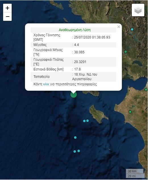 Σεισμική δόνηση μεγέθους 4,4 Ρίχτερ σημειώθηκε στις 04:38 στην Κεφαλονιά σε απόσταση 18 χιλιομέτρων νοτιοδυτικά από το Αργοστόλι. Ο σεισμός είχε εστιακό βάθος 17.8 χιλιομέτρων, σύμφωνα με το Γεωδυναμικό ινστιτούτο Αθηνών.