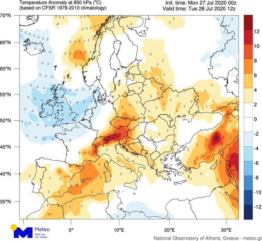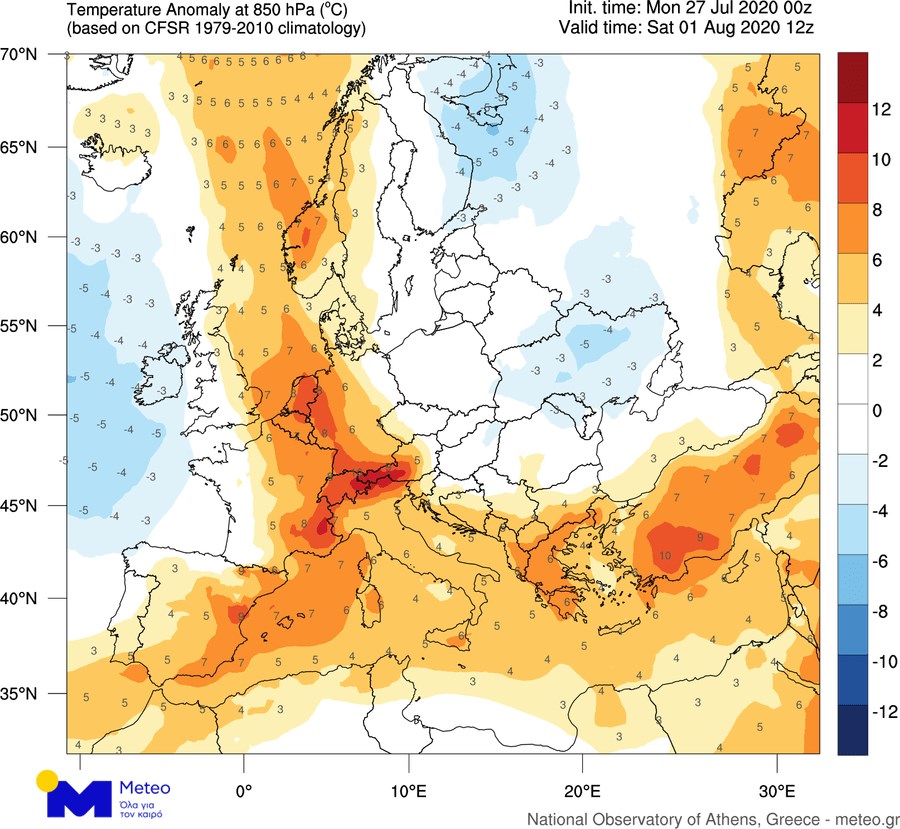 Η κορύφωση του κύματος ζέστης εκτιμάται το τριήμερο Πέμπτη 30 Ιουλίου – Παρασκευή 31 Ιουλίου – Σάββατο 1 Αυγούστου, οπότε συνθήκες καύσωνα θα επικρατήσουν σε αρκετές περιοχές της χώρας, με τον υδράργυρο να ξεπερνά κατά τόπους τους 40 βαθμούς Κελσίου. Στους προγνωστικούς χάρτες παρουσιάζονται οι αέριες μάζες σε ύψος περίπου 1.500 μέτρων την Τρίτη 28 Ιουλίου και το Σάββατο 1η Αυγούστου και πιο συγκεκριμένα η απόκλιση των θερμοκρασιών τους από τις κανονικές για την εποχή τιμές τους. Με πορτοκαλί και κόκκινες αποχρώσεις χρωματίζονται οι θερμές αέριες μάζες. Επισημαίνεται ότι οι θερμοκρασίες των αερίων μαζών που σήμερα, Δευτέρα, κυμαίνονται σχεδόν στα κανονικά για την εποχή επίπεδα, θα βρεθούν 2 με 3 βαθμούς πάνω από αυτά την Τρίτη και 6 με 7 βαθμούς πάνω από αυτά το Σάββατο.