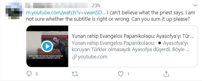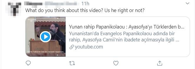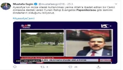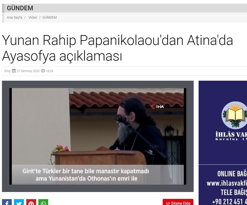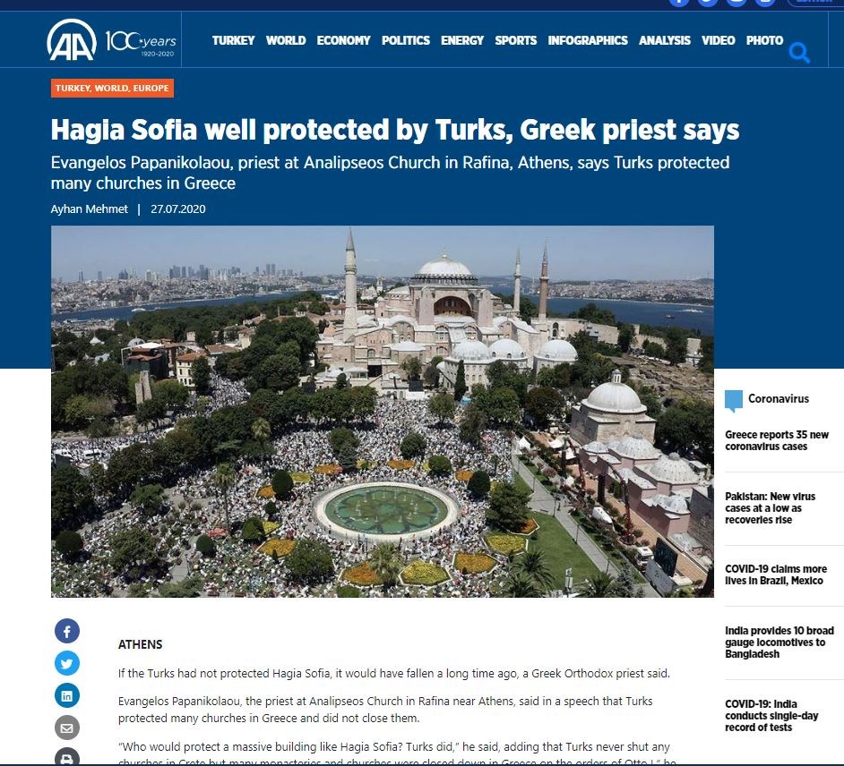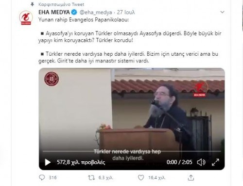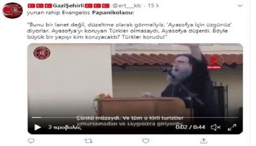 Σάλο έχει προκαλέσει η ομιλία του ιερέα Ευάγγελου Παπανικολάου από τον Ιερό Ναό Αναλήψεως της Ραφήνας για την Αγιά Σοφία και τη μετατροπή της σε τζαμί. Ο τουρκικός Τύπος έκανε ιδιαίτερη αναφορά στον Έλληνα ιερέα, απομόνωσε κομμάτια από την ομιλία του και εστίασε στο γεγονός ότι διερωτήθηκε εάν η μετατροπή της Αγίας Σοφίας σε τζαμί είναι διόρθωση και όχι κατάρα. Τα όσα είπαν δεν έμειναν ασχολίαστα ούτε από τους χρήστες του Twitter.