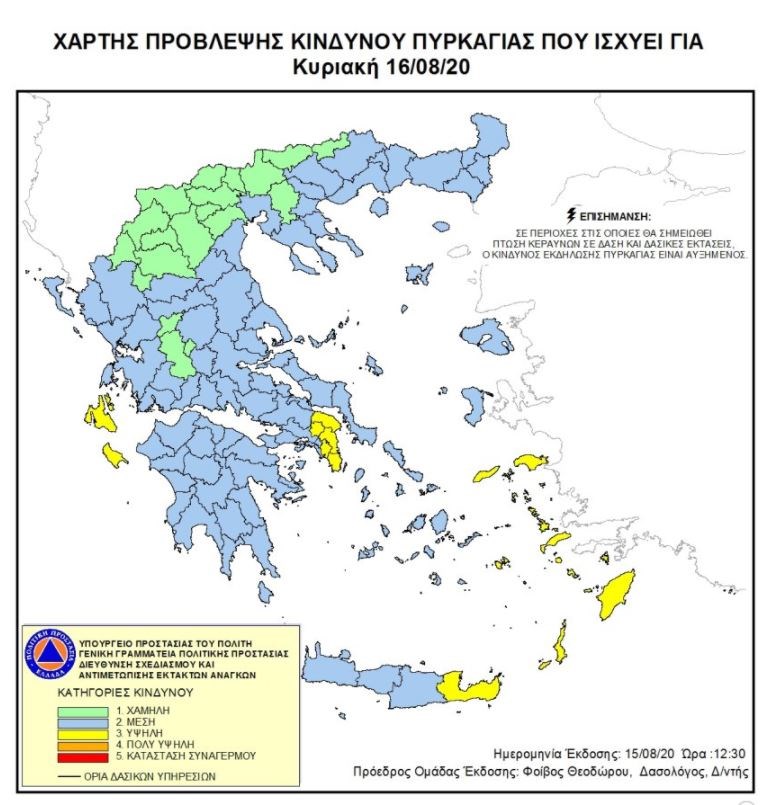 Σύμφωνα με το Χάρτη Πρόβλεψης Κινδύνου Πυρκαγιάς που εκδίδει η Γενική Γραμματεία Πολιτικής Προστασίας του Υπουργείου Προστασίας του Πολίτη, για σήμερα προβλέπεται υψηλός κίνδυνος πυρκαγιάς (κατηγορία κινδύνου 3), σε Αττική, Κεφαλονιά, Ζάκυνθο, Λασίθι, Σάμο, Ικαρία και Δωδεκάνησα.