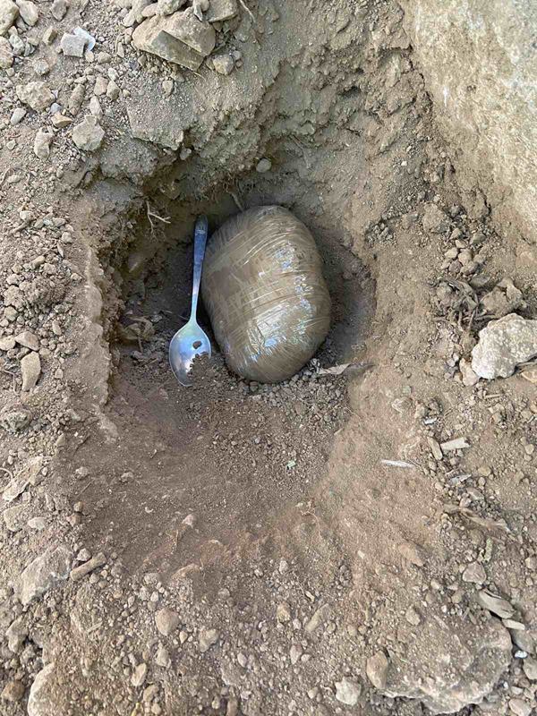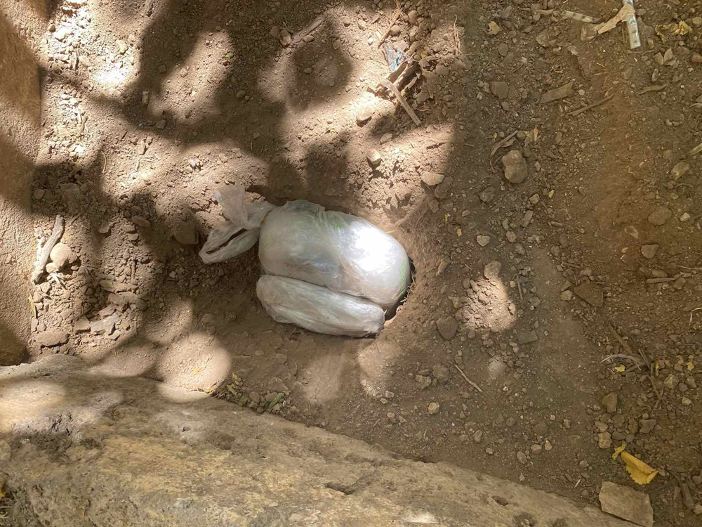 Κατά την έρευνα βρέθηκαν επιμελώς κριμένα σε λάκκους και κατασχέθηκαν: 1.262 γραμ. περίπου χασίς – σοκολάτα, 432 γραμ. περίπου χασίς – φούντα και μεταλλικό κουταλάκι.