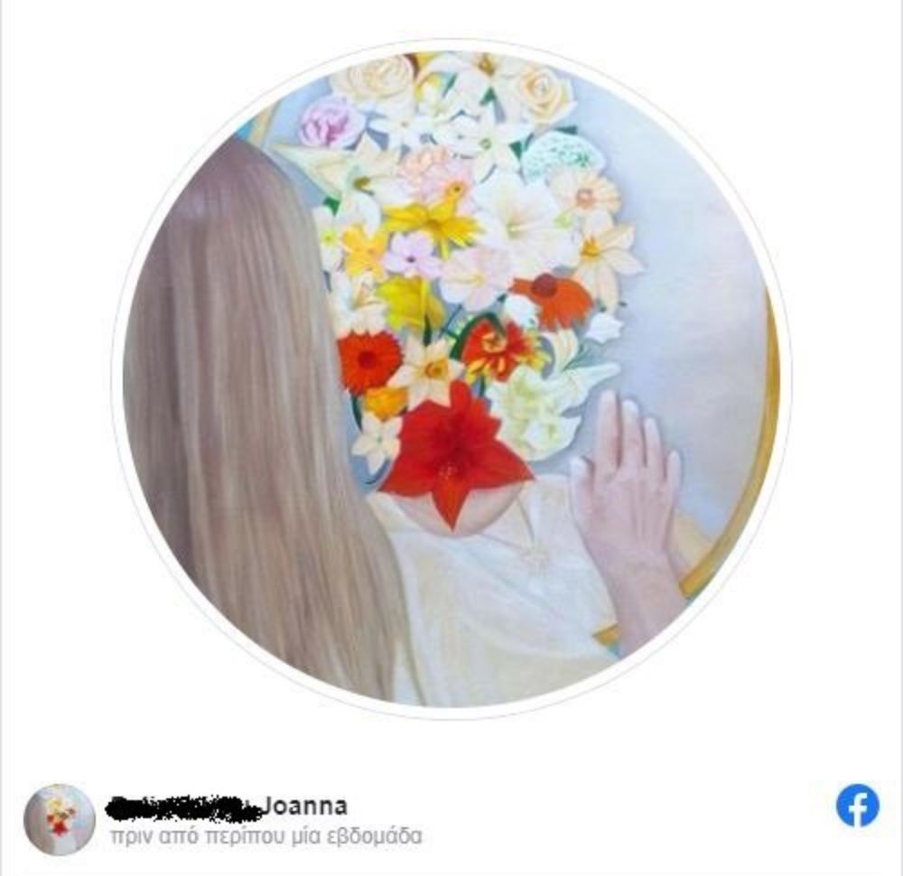 Η Ιωάννα αντικατέστησε την παλιά φωτογραφία του προφίλ της με μια καινούρια. Απεικονίζεται μια ξανθιά γυναίκα να κοιτάζει το πρόσωπό της στον καθρέφτη και να βλέπει ένα πρόσωπο γεμάτο λουλούδια.