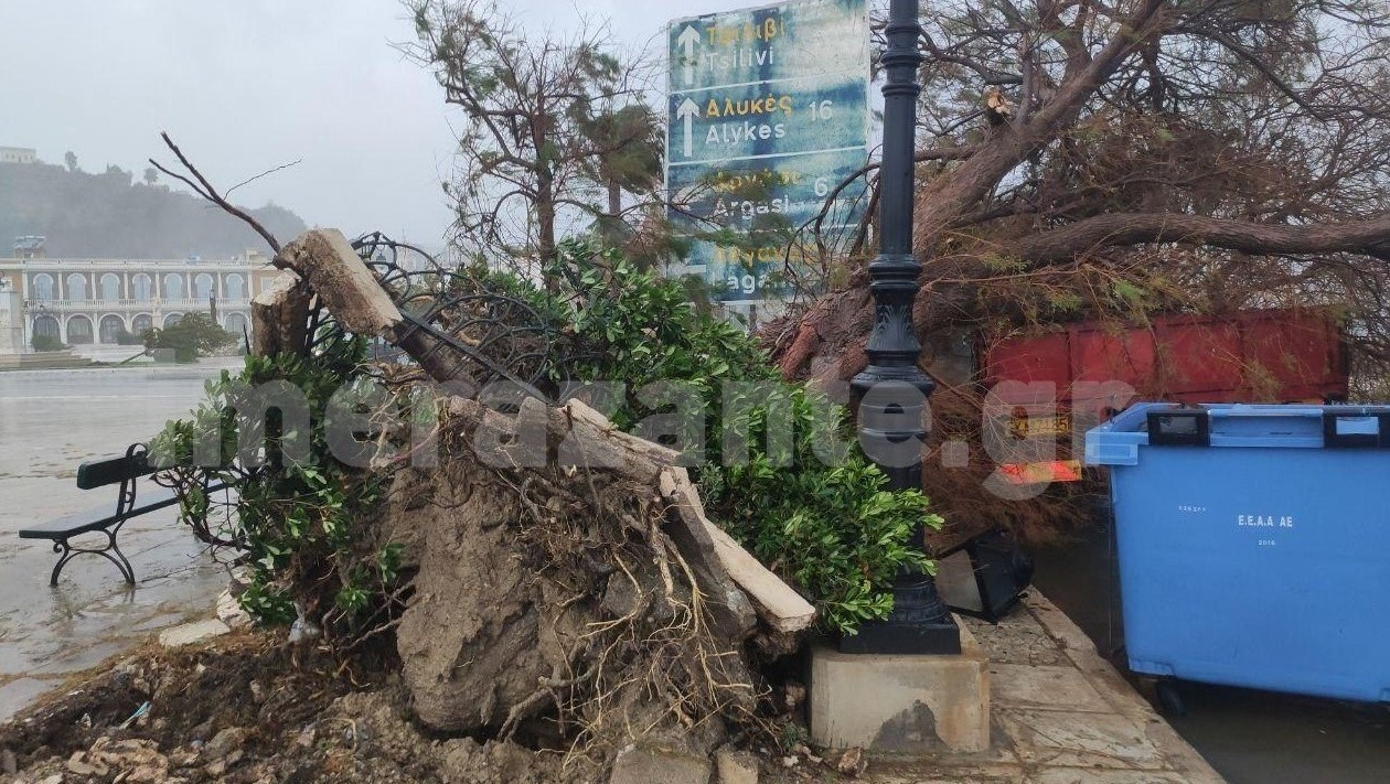 Στη Ζάκυνθο οι άνεμοι ξήλωσαν και έριξαν στον δρόμο επιγραφές καταστημάτων, δέντρα ξεριζώθηκαν και σκάφη βούλιαξαν στο λιμάνι.
