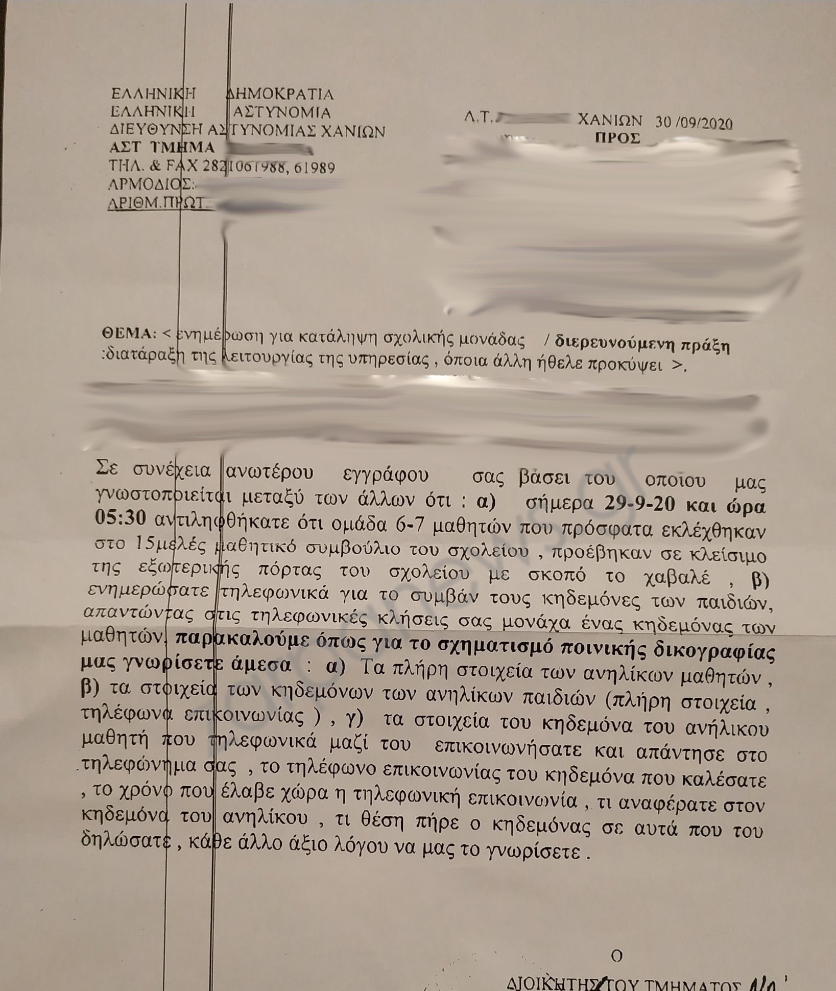 Αναστάτωση προκάλεσε έγγραφο του αστυνομικού τμήματος Πλατανιά που ήρθε στο “φως” της δημοσιότητας και ζητούσε τα στοιχεία των παιδιών που ξεκίνησαν κατάληψη σε σχολείο των Χανίων.