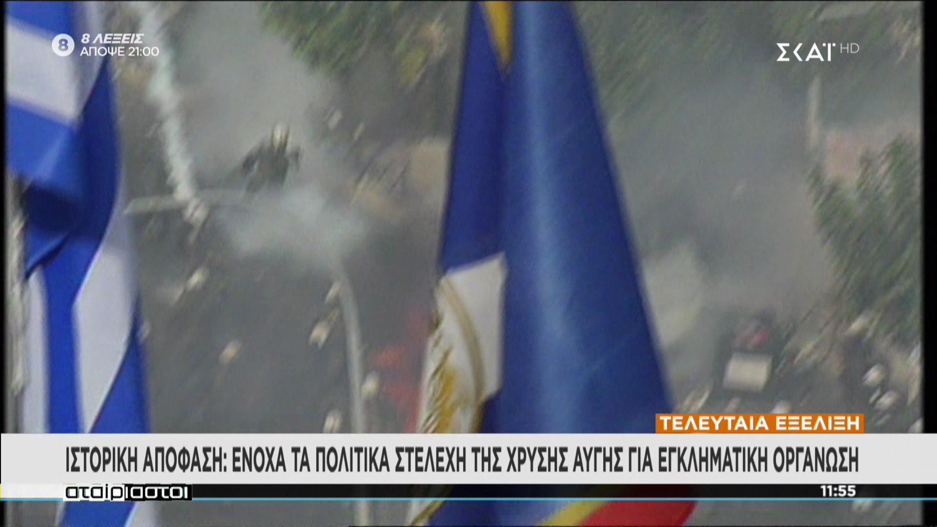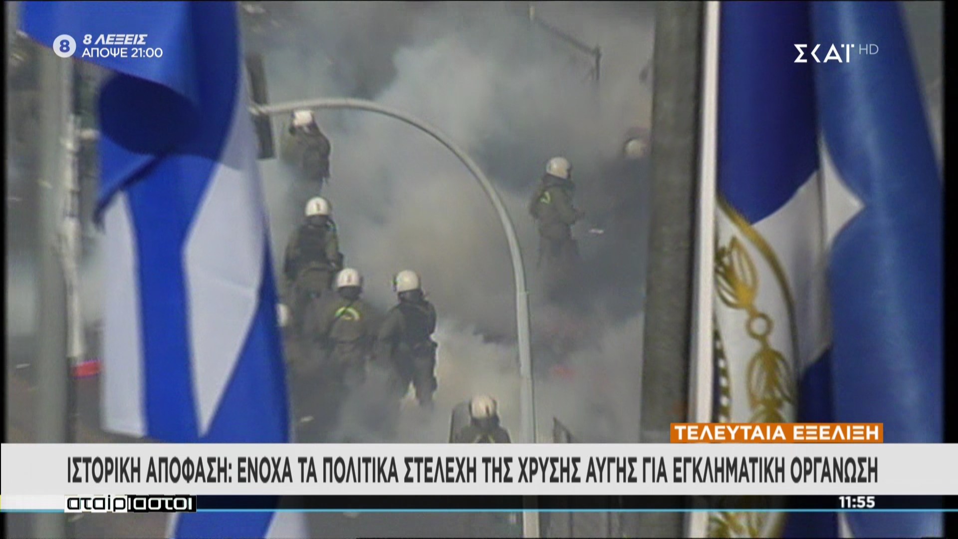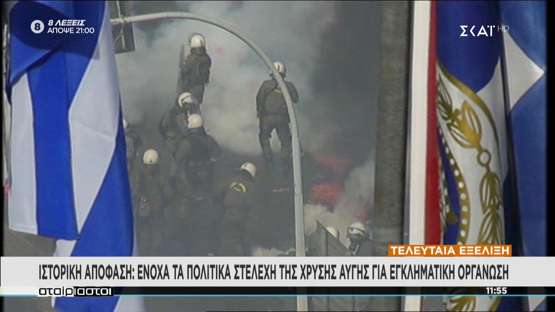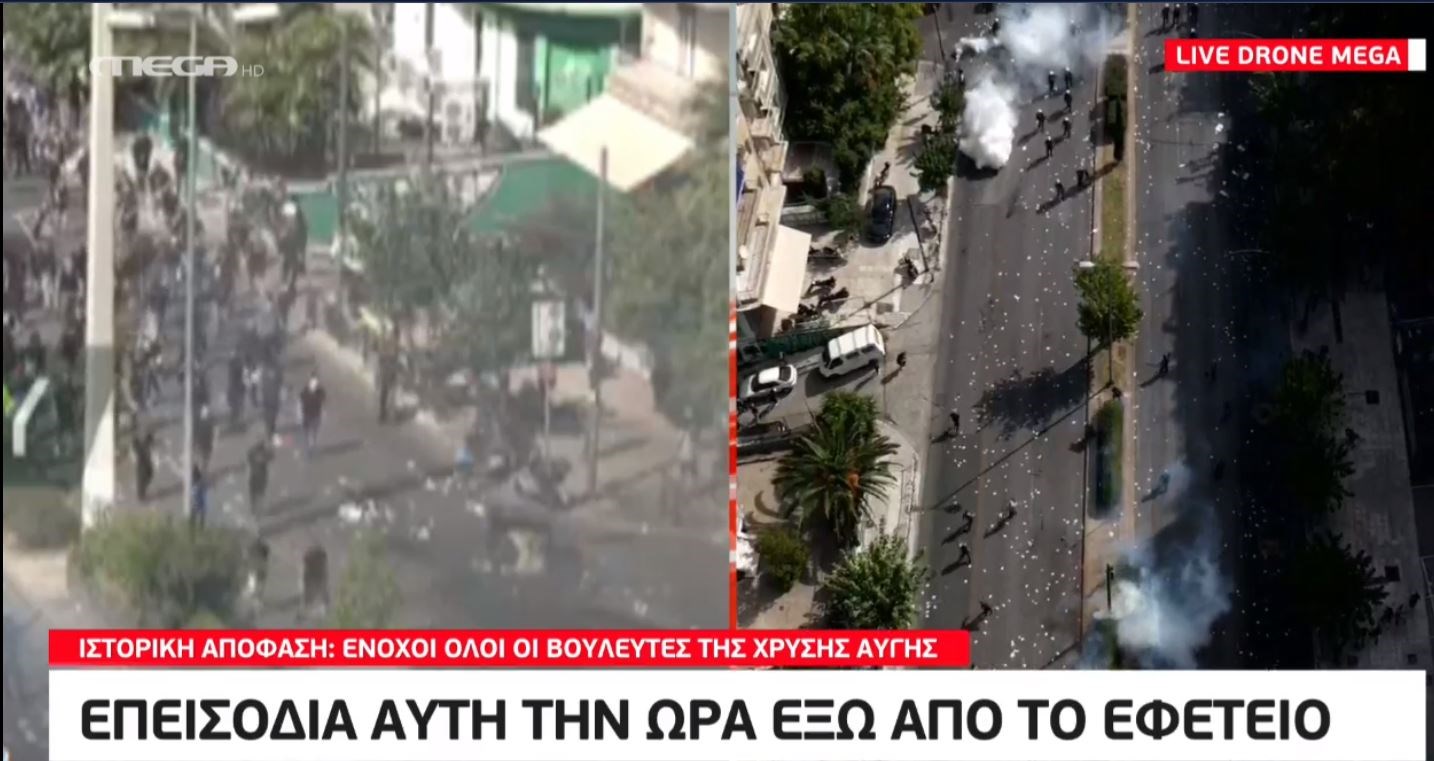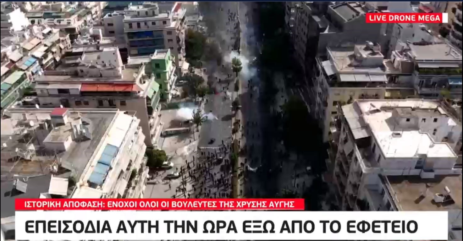 Επεισόδια σημειώνονται αυτήν την ώρα έξω από το Εφετείο, λίγο μετά την απόφαση του Δικαστηρίου σύμφωνα με την οποία κρίνονται ένοχα όλα τα πολιτικά στελέχη της Χρυσής Αυγής για εγκληματική οργάνωση. Άγνωστοι προκάλεσαν επεισόδια πετώντας βόμβες μολότοφ με τις δυνάμεις της αστυνομίας να κάνουν χρήση χημικών. Ως αποτέλεσμα το συγκεντρωμένο πλήθος να διαλυθεί.