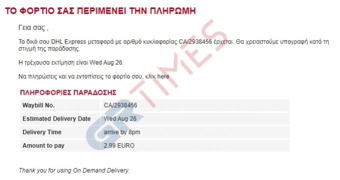 Μάλιστα οι επιτήδειοι παραθέτουν και “αριθμό κυκλοφορίας” του δέματος και με σύνταξη που δεν παραπέμπει σε γνώστη της ελληνικής γλώσσας, αλλά σε αυτόματο μεταφραστή κειμένου, ζητούν μόλις ελάχιστα ευρώ, για να στείλουν ένα «φορτίο», διαδικασία που για να γίνει, πρέπει ο χρήστης να πατήσει πάνω σε έναν ενεργό σύνδεσμο μέσα στο κείμενο.