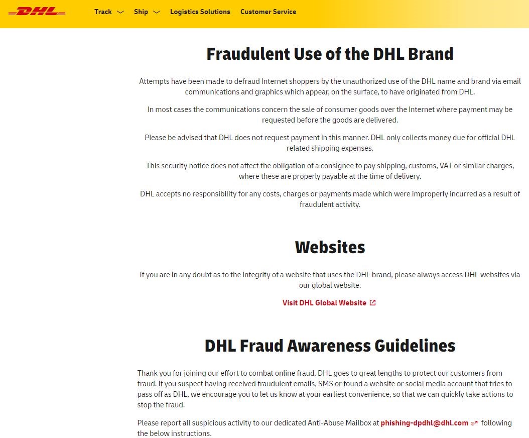 «Λάβετε υπόψη ότι η DHL δεν ζητά πληρωμή με αυτόν τον τρόπο. Η DHL εισπράττει χρήματα που οφείλονται μόνο για επίσημα έξοδα αποστολής που σχετίζονται με την DHL» τονίζει η εταιρεία, προσθέτοντας πως η συγκεκριμένη ειδοποίηση ασφαλείας δεν επηρεάζει την υποχρέωση του παραλήπτη να καταβάλλει έξοδα αποστολής, τελωνείου, ΦΠΑ ή παρόμοιες χρεώσεις, όταν αυτές καταβάλλονται καταλλήλως κατά την παράδοση.