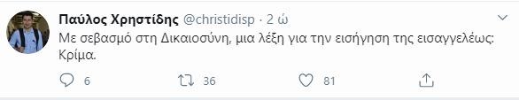 Ο εκπρόσωπος Τύπου του Κινήματος Αλλαγής, Παύλος Χρηστίδης σχολίασε στο Twitter: “Με σεβασμό στη Δικαιοσύνη, μια λέξη για την εισήγηση της εισαγγελέως: Κρίμα”.