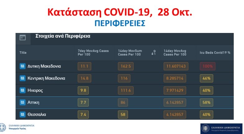 Μόνο τις τελευταίες επτά ημέρες στις ηλικίες άνω των 55 ετών είχαμε περίπου 1.000 κρούσματα, δήλωσε ο κ. Τσιόδρας και πρόσθεσε πως αυτό είναι κάτι που «σημαίνει πως με μαθηματική ακρίβεια θα πιεστεί το Σύστημα Υγείας». Εξήγησε, στη συνέχεια ότι η πληρότητα των ΜΕΘ ανά περιοχή είναι στη Δυτική Μακεδονία: 100%, Κεντρική Μακεδονία: 46%, Ήπειρος: 40%, Αττική: 61%, Θεσσαλονίκη: 60% και Θεσσαλία: 40%.