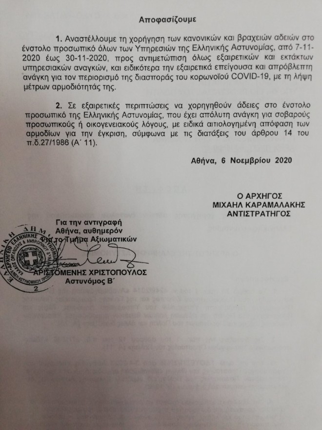 Όπως ανέφερε ο αρχηγός της ΕΛ.ΑΣ., Μιχάλης Καραμαλάκης, μόνο σε εξαιρετικές περιπτώσεις θα χορηγηθούν άδειες στο ένστολο προσωπικό για σοβαρούς προσωπικούς ή οικογενειακούς λόγους.