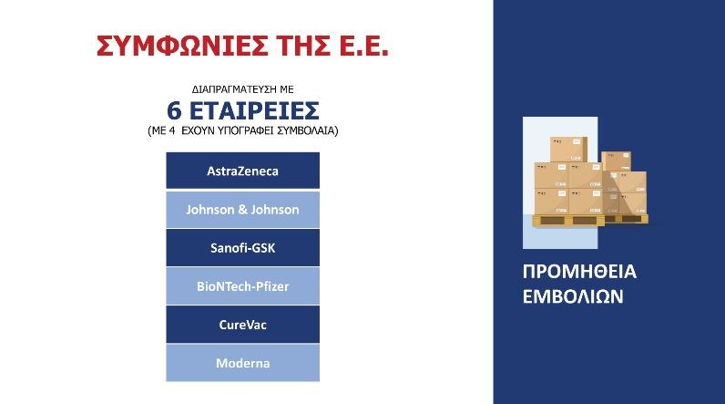 Η Ευρωπαϊκή Ένωση διαπραγματεύεται με έξι εταιρείες που αναπτύσσουν εμβόλιο κατά του κορονοϊού. Με τις τέσσερις εξ’ αυτών έχουν υπογραφεί σχετικά συμβόλαια.