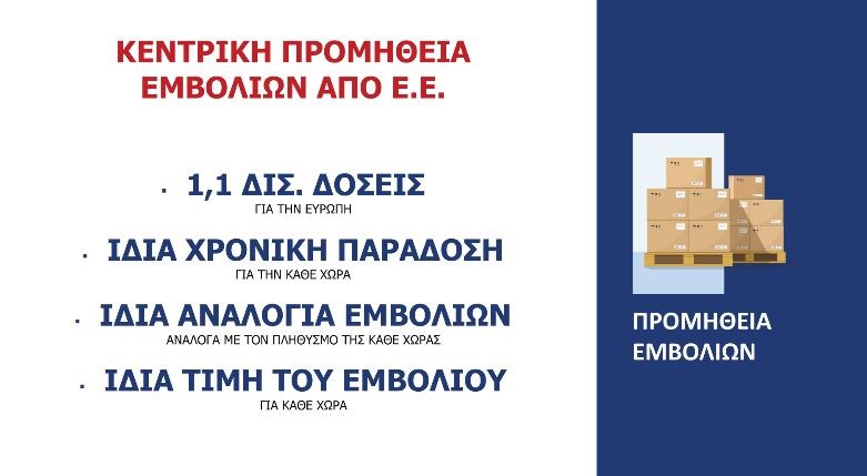 Όπως εξήγησε, θα υπάρχει κεντρική προμήθεια εμβολίων από την ΕΕ για 1,1 δισ. δόσεις, που στη συνέχεια θα διανεμηθούν στα κράτη-μέλη. Σημειώνεται ότι θα είναι ίδια η χρονική παράδοση για κάθε χώρα, η αναλογία εμβολίων θα σχετίζεται με τον πληθυσμό της κάθε χώρας και βέβαια η τιμή του εμβολίου θα είναι ίδια. Ο υπουργός Υγείας διευκρίνισε ότι η Ευρωπαϊκή Ένωση θα συμβάλλει στην τιμή του εμβολίου και έτσι τα κράτη θα λάβουν τελικά τα εμβόλια σε χαμηλότερο τίμημα.