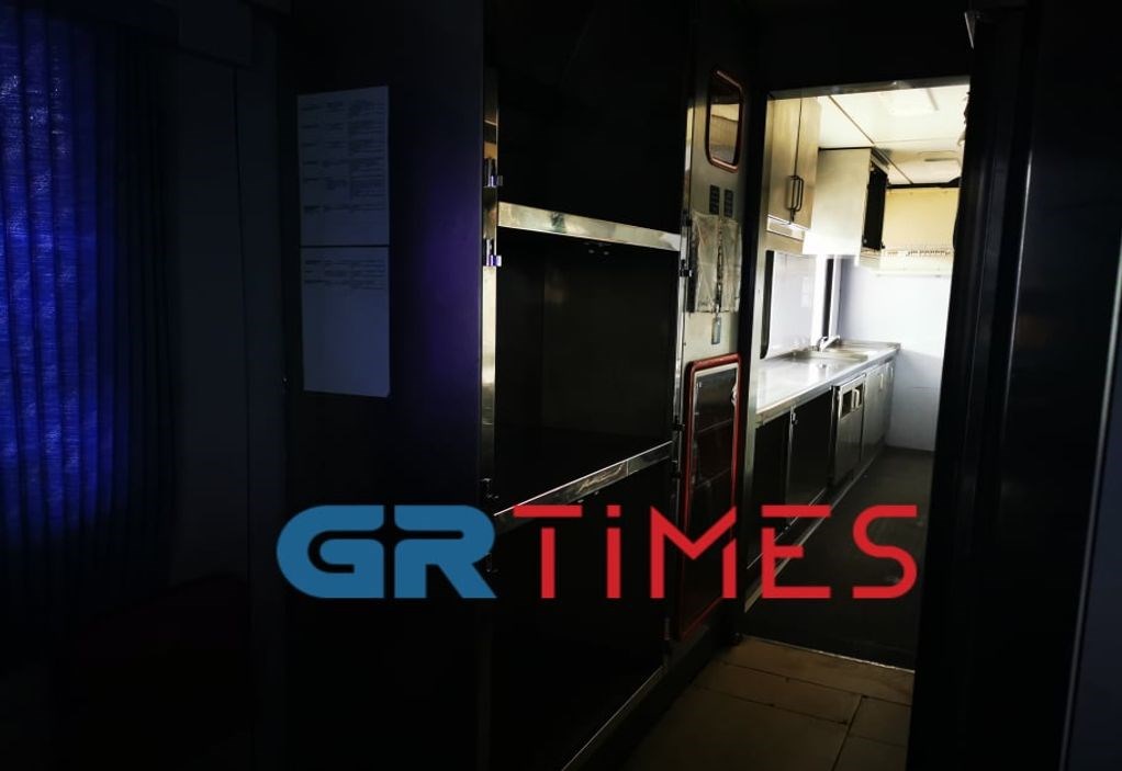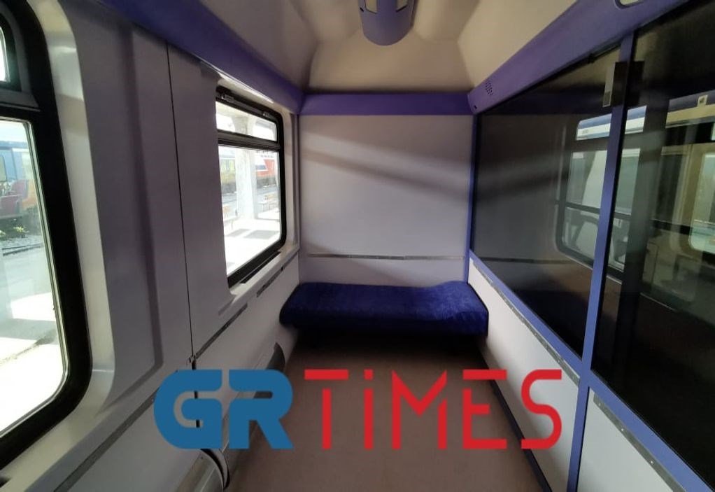Ο συρμός βρίσκεται στο Ν.Σ. Σταθμό της Θεσσαλονίκης σε σημείο που θα μπορεί να γίνει ευκολότερα και με ασφάλεια η μεταφορά των ασθενών και τα βαγόνια αναμένεται να διαμορφωθούν κατάλληλα για διακομιδές ασθενών εφόσον προκύψει αυτή η ανάγκη. Όπως μπορείτε να δείτε, στα βαγόνια υπάρχουν θέσεις καθήμενων, όπως ακριβώς ένα λεωφορείο – πούλμαν, ωστόσο από τους διαδρόμους θα μπορούσε να περάσει φορείο.