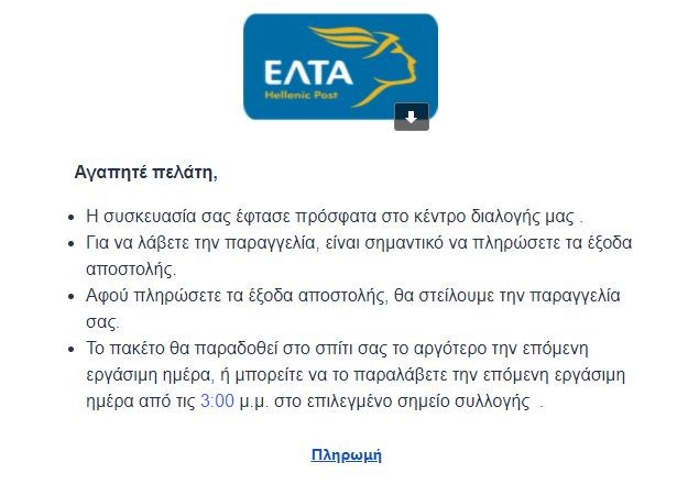 Απατεώνες εκμεταλλεύονται την καραντίνα και χρησιμοποιώντας την επωνυμία των ΕΛΤΑ προσπαθούν να αποσπάσουν χρήματα από ανυποψίαστους πολίτες.
