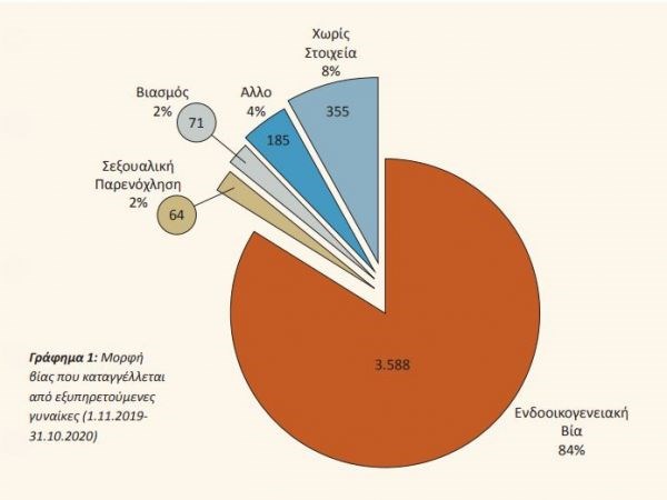 Η επικρατέστερη μορφή βίας για την περίοδο αναφοράς είναι η ενδοοικογενειακή βία σε ποσοστό 84% από το σύνολο των καταγεγραμμένων μορφών βίας στα Συμβουλευτικά Κέντρα ανά την επικράτεια, ενώ ακολουθούν με μικρότερα ποσοστά η σεξουαλική παρενόχληση και ο βιασμός 2%, άλλη μορφή βίας «‘Άλλο» 4%, ενώ το 8% δεν αποκάλυψε αυτά τα στοιχεία.