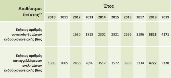 Το διάστημα 2012-2019 η αύξηση που καταγράφεται στον ετήσιο ς αριθμός γυναικών θυμάτων συντροφικής βίας η είναι της τάξης του 156%. Το 2019, 4.171 γυναίκες κατήγγειλαν ενδοοικογενειακή βία στην αστυνομία, αύξηση 9,3% σε σχέση με το 2018, όπου ο αντίστοιχος αριθμός ανέρχονταν σε 3.815. Το 2019 το 85% των θυτών που υπήχθησαν στην διαδικασία της ποινικής διαμεσολάβησης ήταν άνδρες.