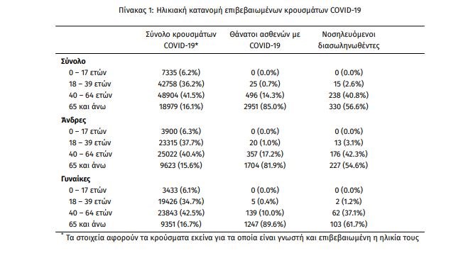 Όπως φαίνεται στον σημερινό πίνακα, από την έναρξη της πανδημίας έχουν χάσει τη ζωή τους 25 ασθενείς, ηλικίας κάτω των 40 ετών, ενώ 496 θύματα ανήκαν στην ηλικιακή ομάδα 40-64 ετών και η μεγάλη πλειοψηφία (2.951) ήταν ηλικίας 65 ετών και άνω.