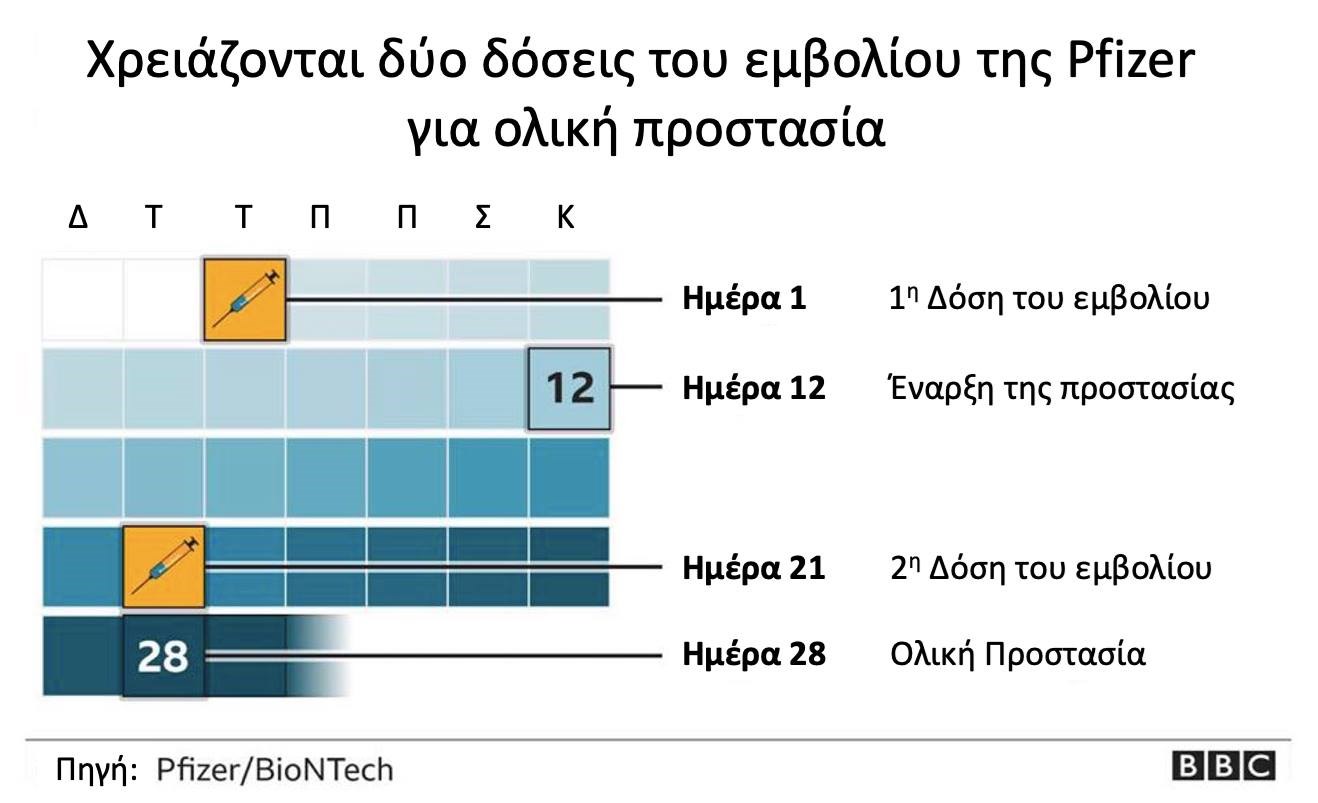 “Το εμβόλιο των Pfizer/ BioNTech όπως δείχνουν τα δημοσιευμένα αποτελέσματα (DOI: 10.1056/NEJMoa2034577) θα μας παρέχει ολική προστασία από τον κορωνοϊό 1 εβδομάδα μετά τη δεύτερη δόση του. Ο εμβολιασμός γίνεται στο μπράτσο και η δεύτερη δόση θα πρέπει να χορηγηθεί τουλάχιστον 21 ημέρες μετά την πρώτη. Έχω αναφέρει και παλαιότερα πως το υψηλό ποσοστό αποτελεσματικότητας (95%) υπολογίστηκε 7 ημέρες μετά τη δεύτερη δόση. Ας περιμένουμε όμως για περισσότερο από 7 ημέρες, καλύτερα για δύο εβδομάδες, για να είμαστε σίγουροι. Άρα, τι σημαίνει πρακτικά πως έχουμε κάνει και τις 2 δόσεις του εμβολίου; Θα συνεχίζουμε να προσέχουμε από την έναρξη της πρώτης δόσης για 4-5 εβδομάδες. Όπως βλέπετε και στο σχήμα (και με περισσότερες λεπτομέρειες στη δημοσίευση του NEJM: https://www.nejm.org/doi/10.1056/NEJMoa2034577…), θα υπάρχει κάποια προστασία και πριν από αυτό το διάστημα, αλλά αυτός είναι ο χρόνος που ενδείκνυται για να ξεκινήσει η πλήρης προστασία. Είναι πιθανό η αποτελεσματικότητα του εμβολίου να είναι λίγο μικρότερη όταν γίνουν μαζικοί εμβολιασμοί, ίσως για τους πολύ μεγάλους σε ηλικία ή τους ανοσοκατεσταλμένους. Όμως, δεν αναμένεται να είναι πολύ μικρότερα αυτά τα ποσοστά. Θα μάθουμε περισσότερα σχετικά με την έκταση της προστασίας και πόσο διαρκεί καθώς εισέρχονται δεδομένα και από τις τρέχουσες κλινικές δοκιμές και από το μαζικό εμβολιασμό που ξεκίνησε ήδη στο Ηνωμένο Βασίλειο και αναμένεται να ξεκινήσει και στις ΗΠΑ” αναφέρει.