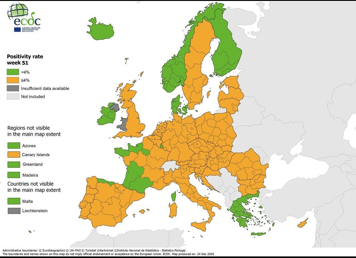 Κάτω από το 4% διαμορφώνεται ο δείκτης θετικότητας στην Ελλάδα, όπως φαίνεται και στον επίσημο χάρτη του Ευρωπαϊκού Κέντρου Πρόληψης και Ελέγχου Νόσων (ECDC), αφήνοντας μια μικρή “χαραμάδα” αισιοδοξίας. Οι περισσότερες χώρες της Ευρώπης παραμένουν στην κίτρινη ζώνη, δηλαδή με θετικότητα μεγαλύτερη του 4%.