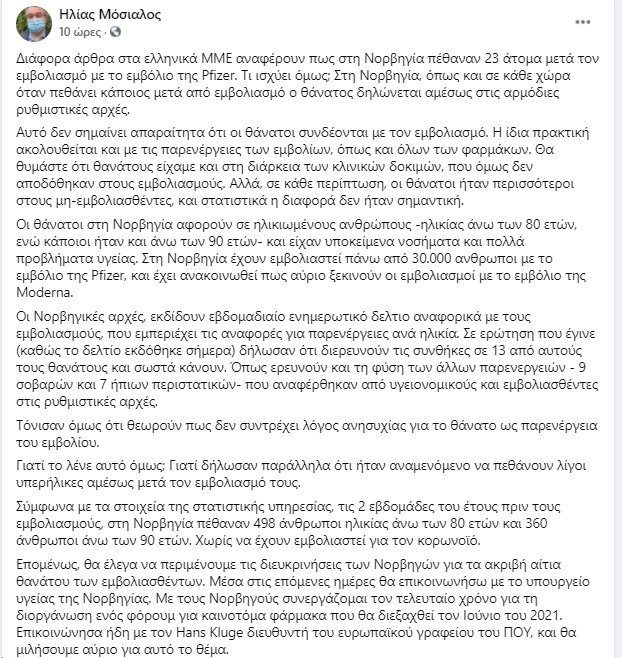 Τις αναφορές για 23 θανάτους ανθρώπων στη Νορβηγία, οι οποίοι είχαν κάνει το εμβόλιο κατά του κορονοϊού, σχολίασε ο καθηγητής Πολιτικής της Υγείας του LSE, Ηλίας Μόσιαλος. “Διάφορα άρθρα στα ελληνικά ΜΜΕ αναφέρουν πως στη Νορβηγία πέθαναν 23 άτομα μετά τον εμβολιασμό με το εμβόλιο της Pfizer. Τι ισχύει όμως; Στη Νορβηγία, όπως και σε κάθε χώρα όταν πεθάνει κάποιος μετά από εμβολιασμό ο θάνατος δηλώνεται αμέσως στις αρμόδιες ρυθμιστικές αρχές.