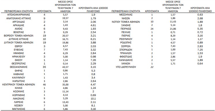 Έτσι σύμφωνα με την κατανομή ανά περιφερειακή ενότητα, από τα 297 νέα εγχώρια κρούσματα τα 137 εντοπίστηκαν στην Αττική, ενώ 35 στη Θεσσαλονίκη. Να σημειωθεί πως καμία άλλη περιφερειακή ενότητα δεν παρουσιάζει διψήφιο αριθμό.