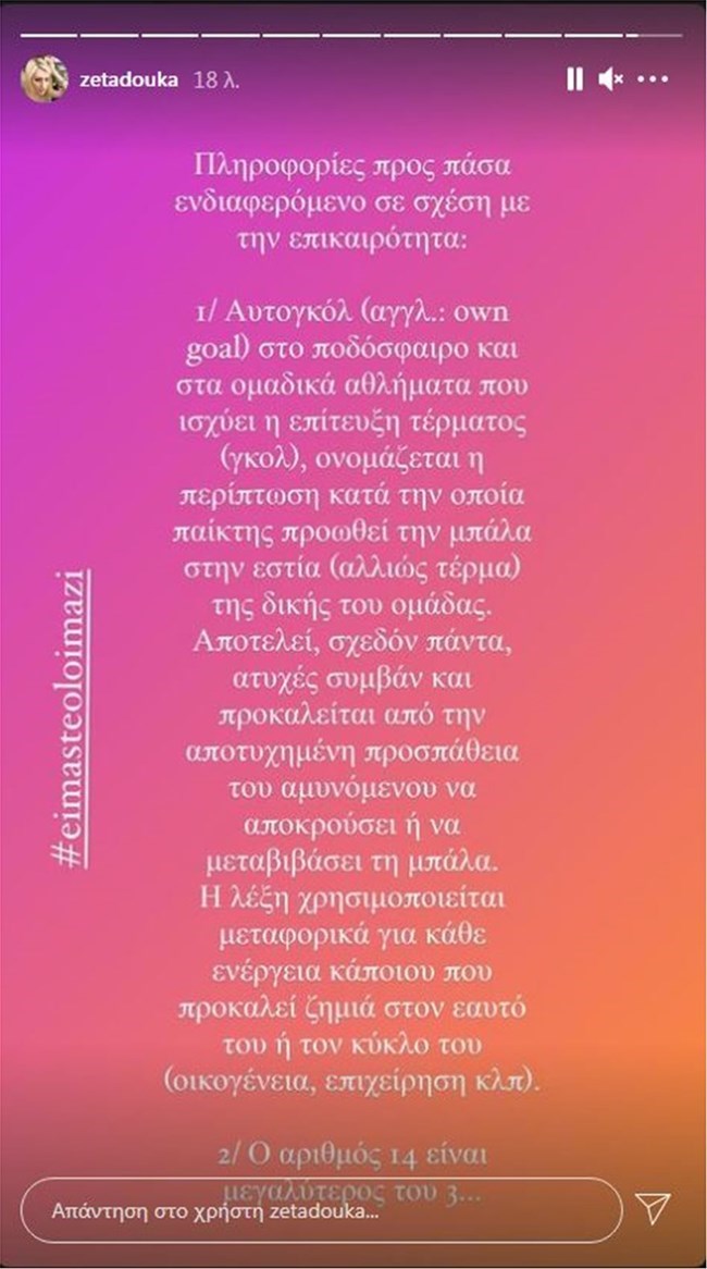 Συνέχεια στο αινιγματικό σχόλιο του Αντώνη Καφετζόπουλου περί “αυτογκόλ” έδωσε η Ζέτα Δούκα με ανάρτηση που έκανε στο Instagram.