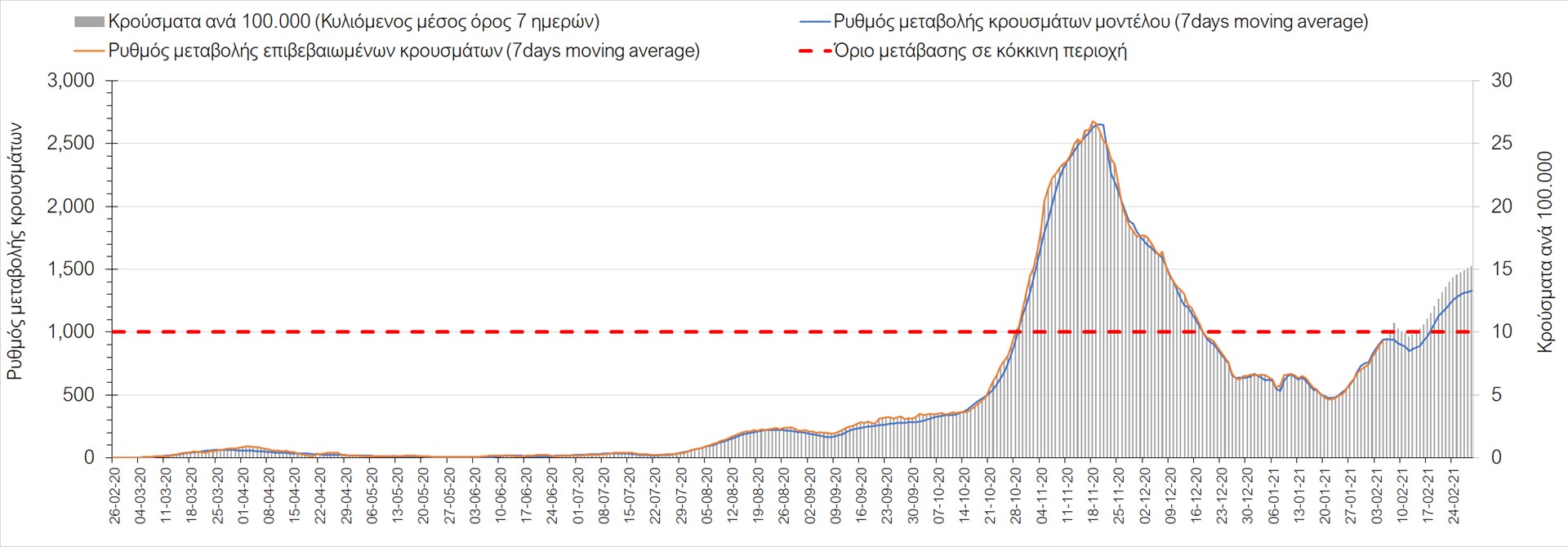 Πορεία του ημερησίου αριθμού των κρουσμάτων (κυλιόμενος μέσος όρος 7 ημερών) στην Ελληνική επικράτεια