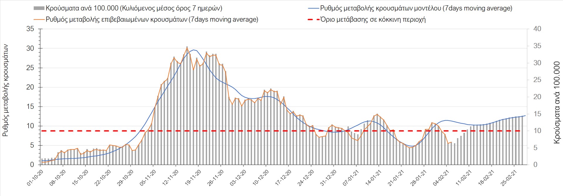 Στην ανάλυσή τους πλέον έχουν ενσωματώσει την ένδειξη των κόκκινων περιοχών αλλά τη δυναμική τους να παραμείνουν κόκκινες ή να πέσουν σε πορτοκαλί χρώμα. (Η διακεκομμένη γραμμή υποδηλώνει το όριο μετάβασης σε κόκκινη περιοχή)