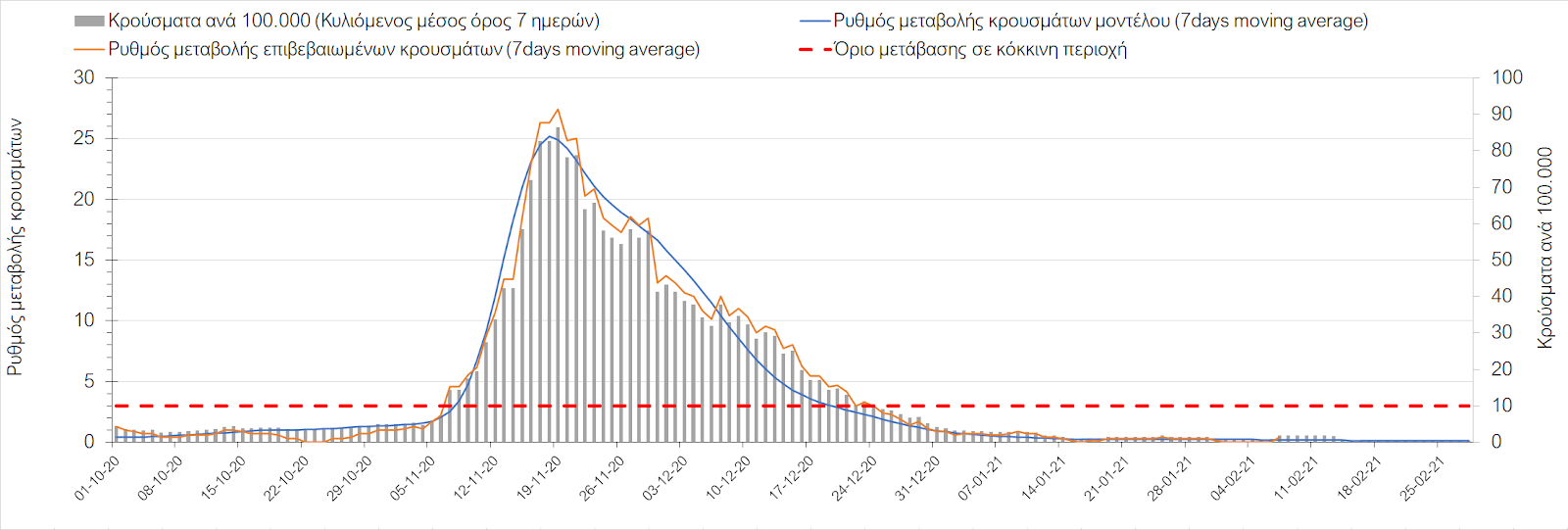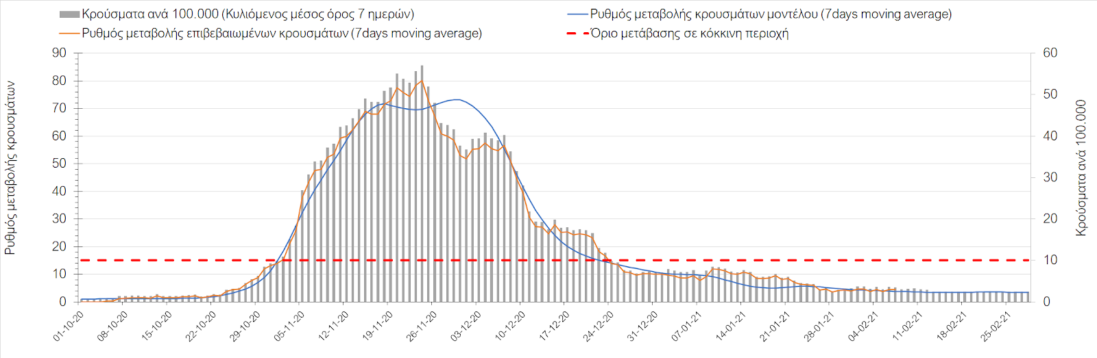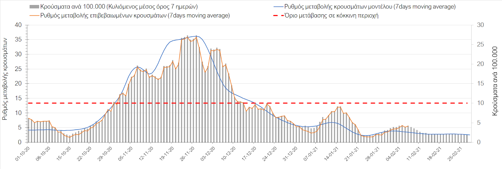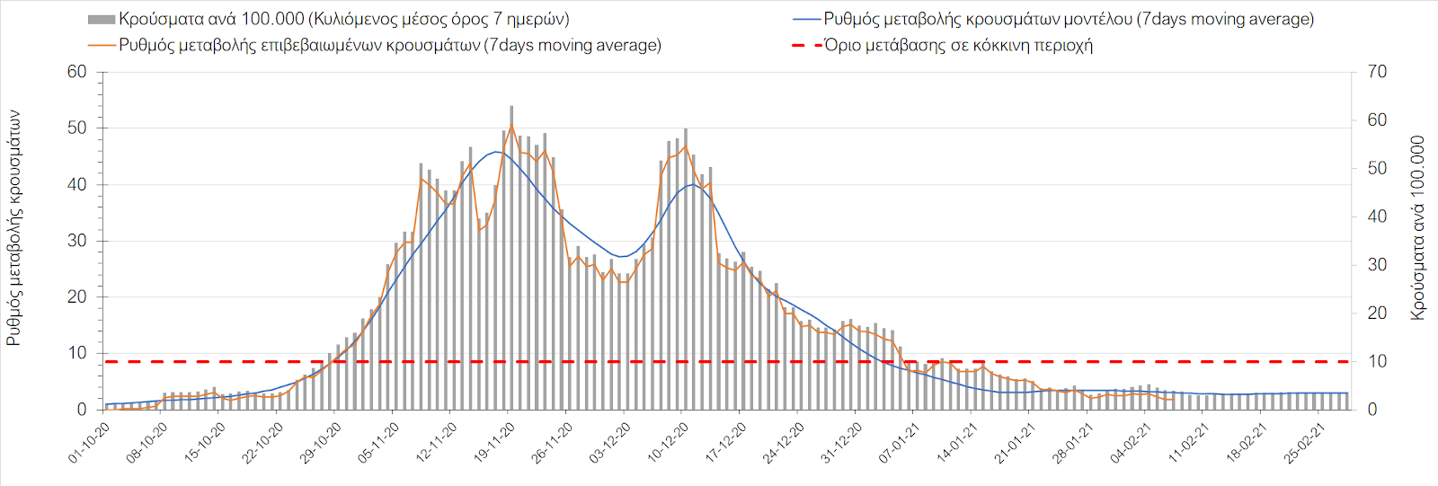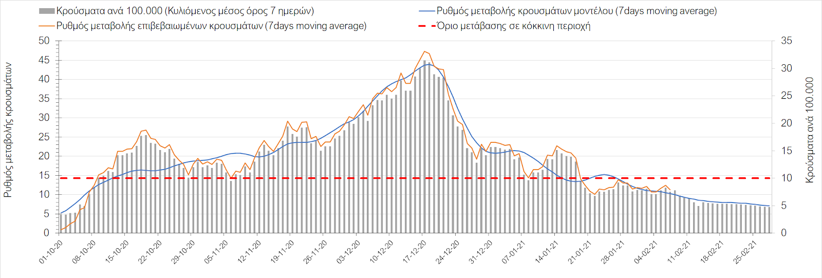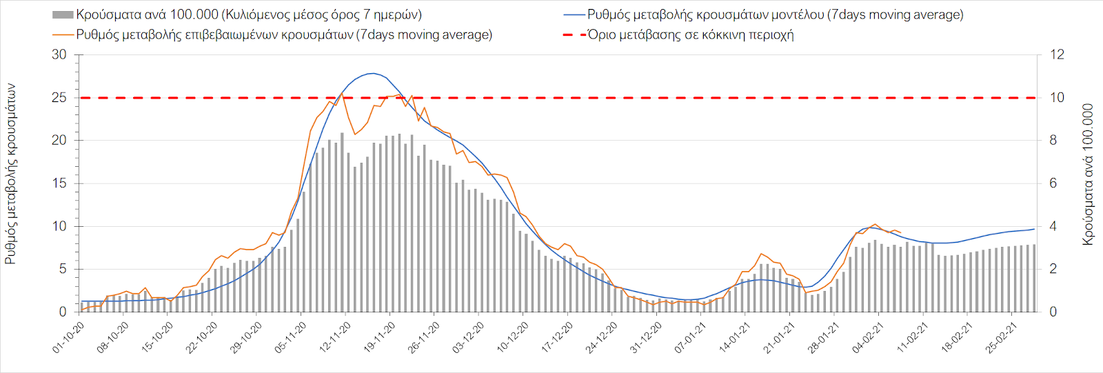 Όπως φαίνεται από το διάγραμμα, από τις 8 Ιανουαρίου έχουμε μια αύξηση κρουσμάτων μέχρι τις 11 Ιανουαρίου η οποία οφείλεται στη μείωση της περιστολής που σημειώθηκε στις γιορτές. Από τις 11 μέχρι τις 18 Ιανουαρίου προβλεπόταν μια μείωση κρουσμάτων λόγω της εφαρμογής του lockdown και η οποία όντως παρατηρήθηκε. Εντούτοις, όπως είχαμε προβλέψει, από τις 23 Ιανουαρίου και έπειτα διαφαίνεται αύξηση στον κυλιόμενο μέσο όρο των κρουσμάτων. Η εφαρμογή των περιοριστικών μέτρων, σε συνδυασμό με την επικρατούσα μετεωρολογία πρόκειται να επιφέρει μια σταθεροποίηση ή και ελαφρά μείωση των κρουσμάτων τις επόμενες ημέρες. Παρ’ολ’αυτά, μετά από τις 17/2 προβλέπεται μια περαιτέρω αύξηση των κρουσμάτων.