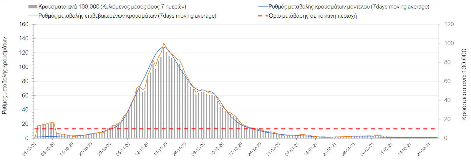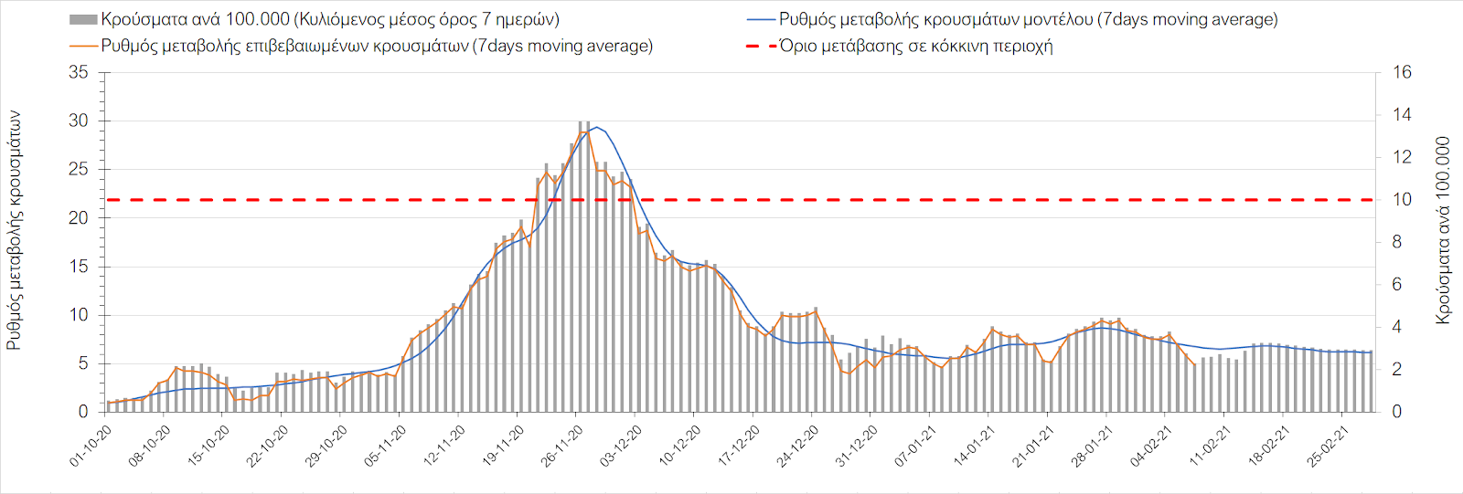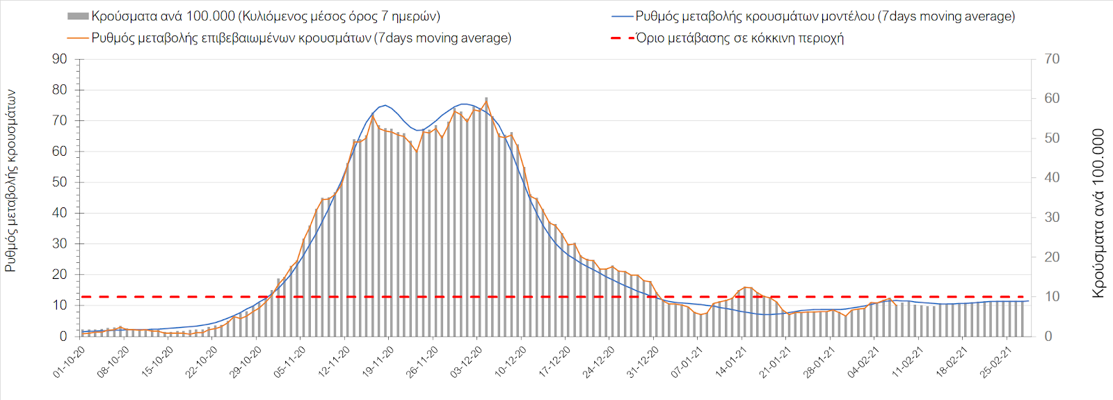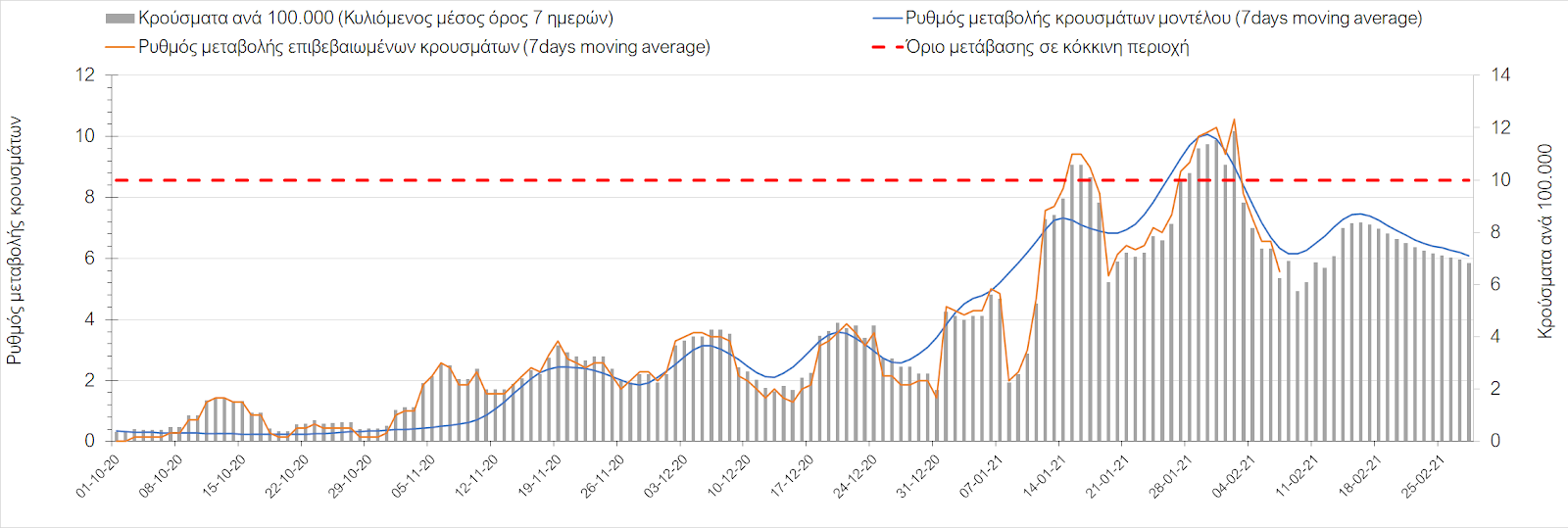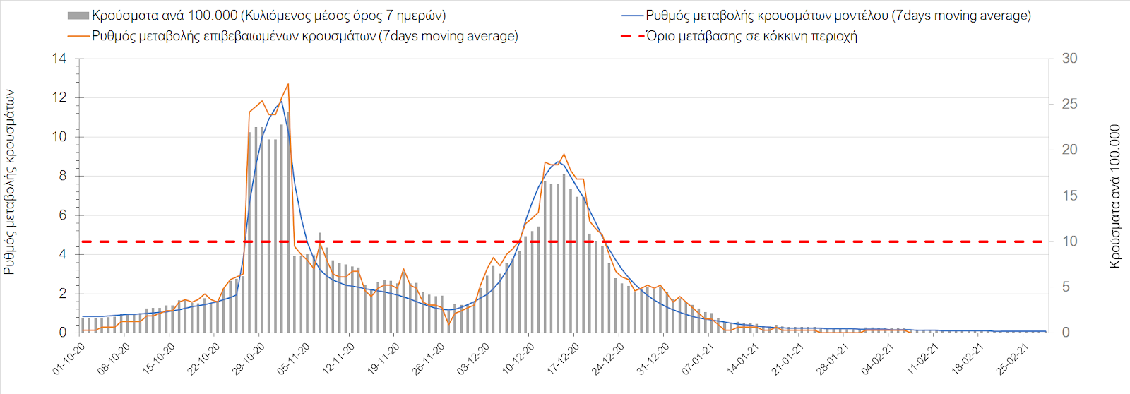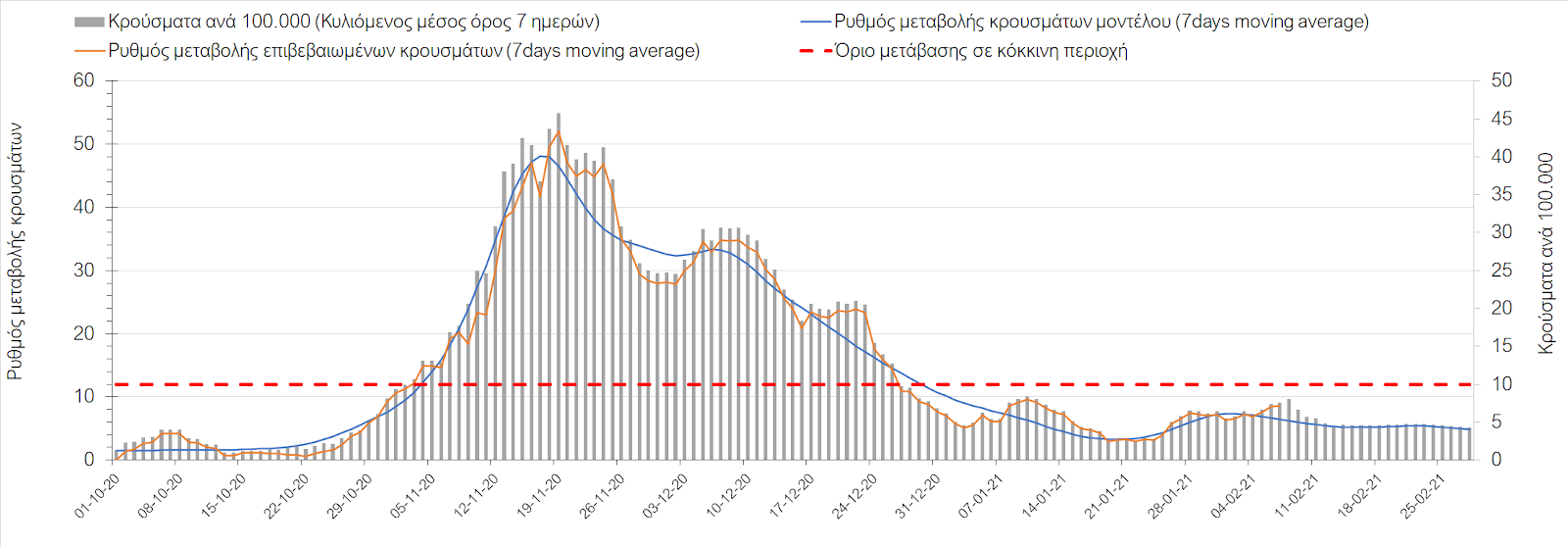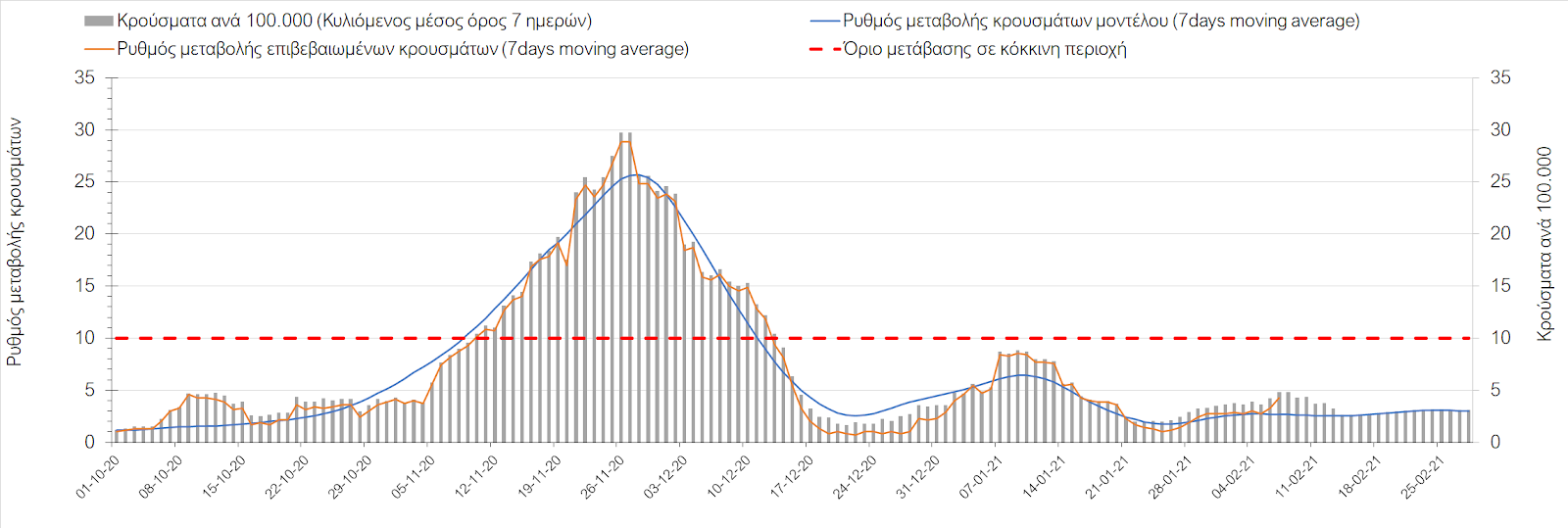 Όπως φαίνεται από το διάγραμμα, από τις 8 Ιανουαρίου έχουμε μια αύξηση κρουσμάτων μέχρι τις 11 Ιανουαρίου η οποία οφείλεται στη μείωση της περιστολής που σημειώθηκε στις γιορτές. Από τις 11 μέχρι τις 18 Ιανουαρίου προβλεπόταν μια μείωση κρουσμάτων λόγω της εφαρμογής του lockdown και η οποία όντως παρατηρήθηκε. Εντούτοις, όπως είχαμε προβλέψει, από τις 23 Ιανουαρίου και έπειτα διαφαίνεται αύξηση στον κυλιόμενο μέσο όρο των κρουσμάτων. Η εφαρμογή των περιοριστικών μέτρων, σε συνδυασμό με την επικρατούσα μετεωρολογία πρόκειται να επιφέρει μια σταθεροποίηση ή και ελαφρά μείωση των κρουσμάτων τις επόμενες ημέρες. Παρ’ολ’αυτά, μετά από τις 17/2 προβλέπεται μια περαιτέρω αύξηση των κρουσμάτων.