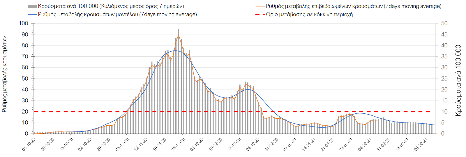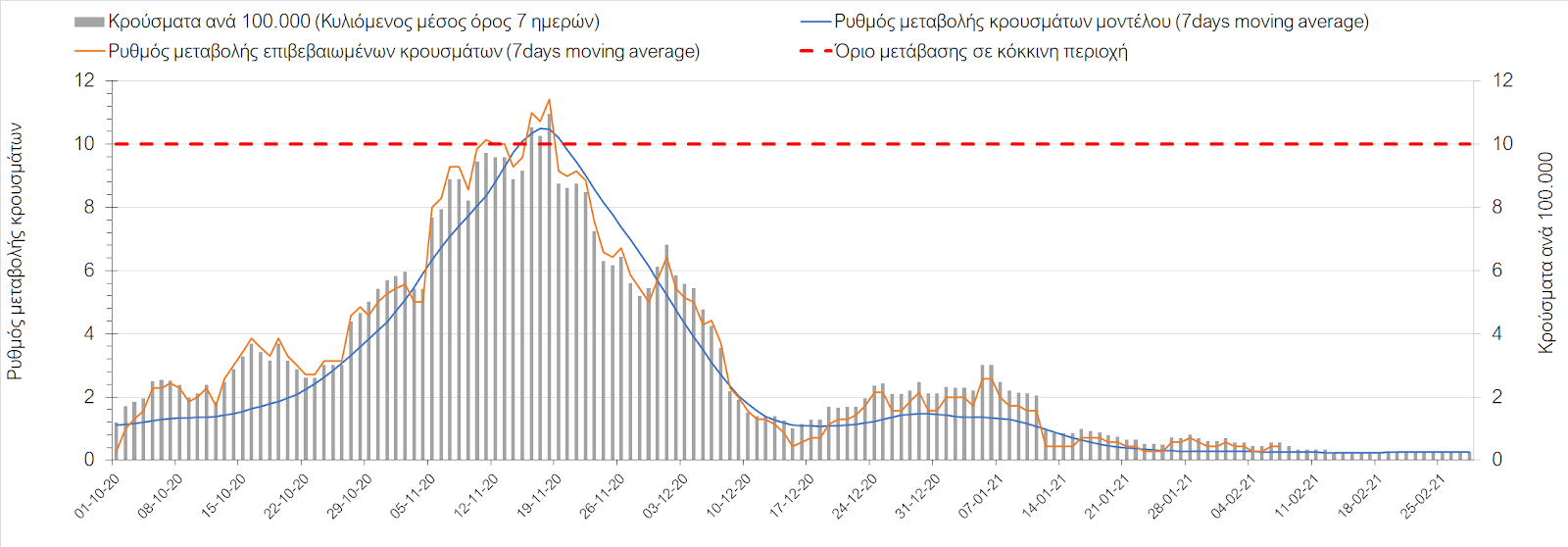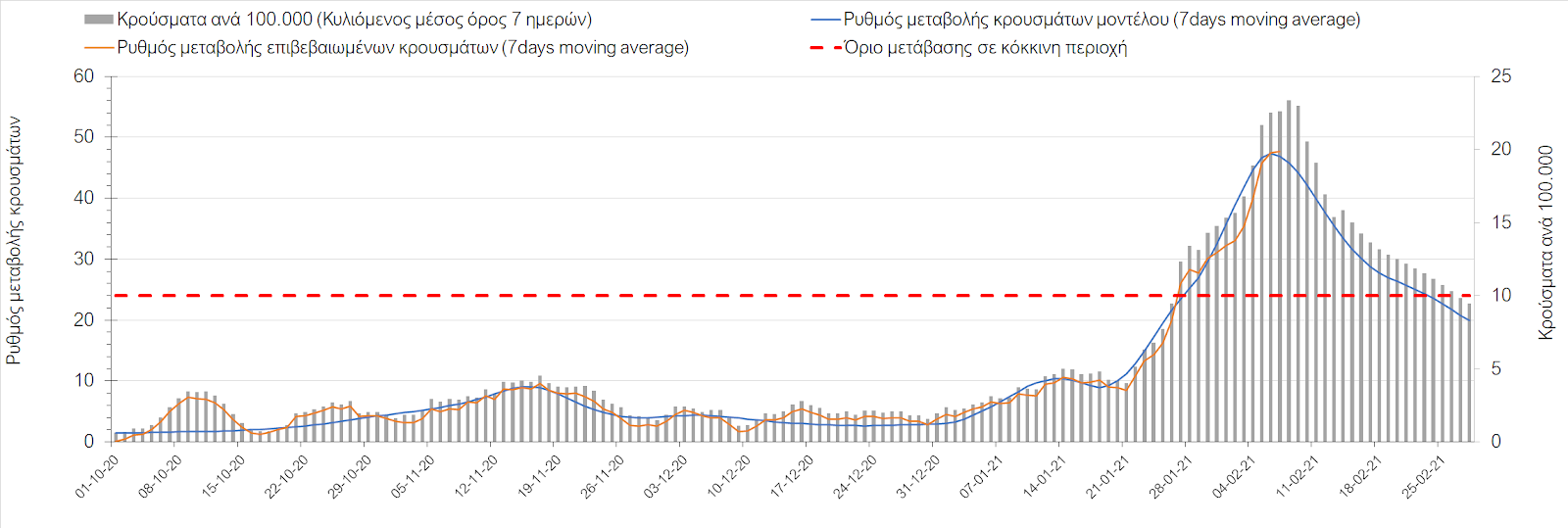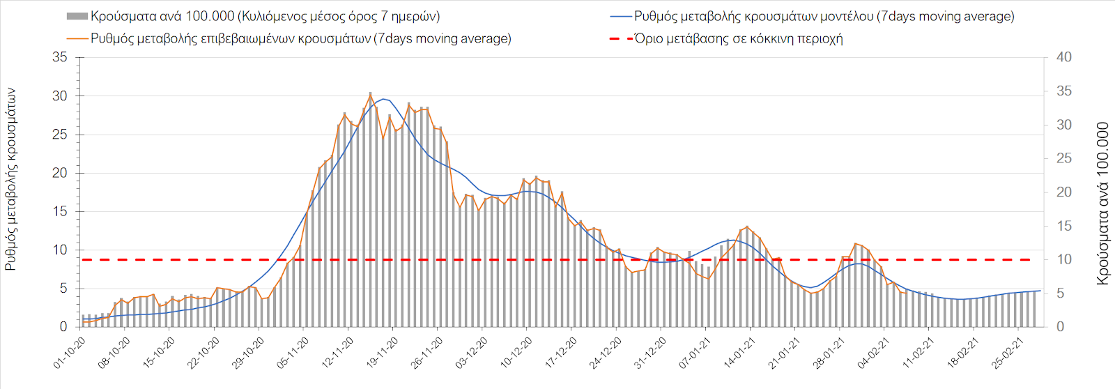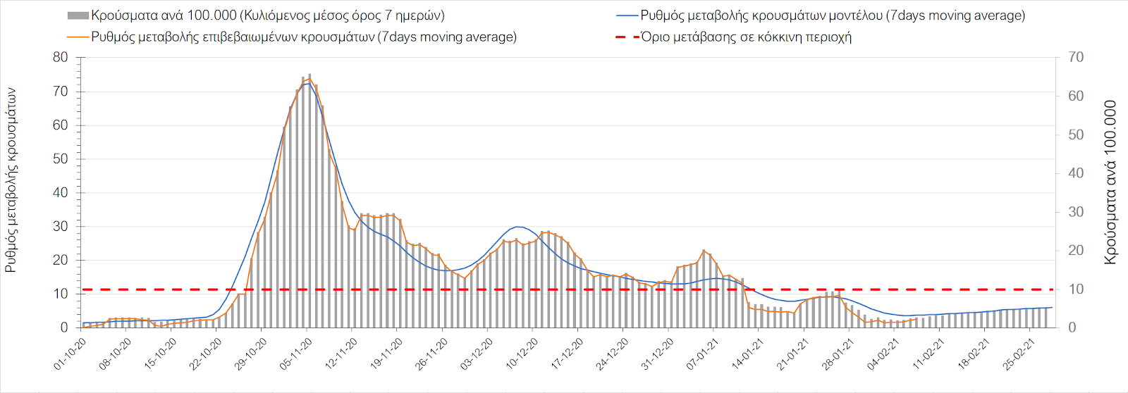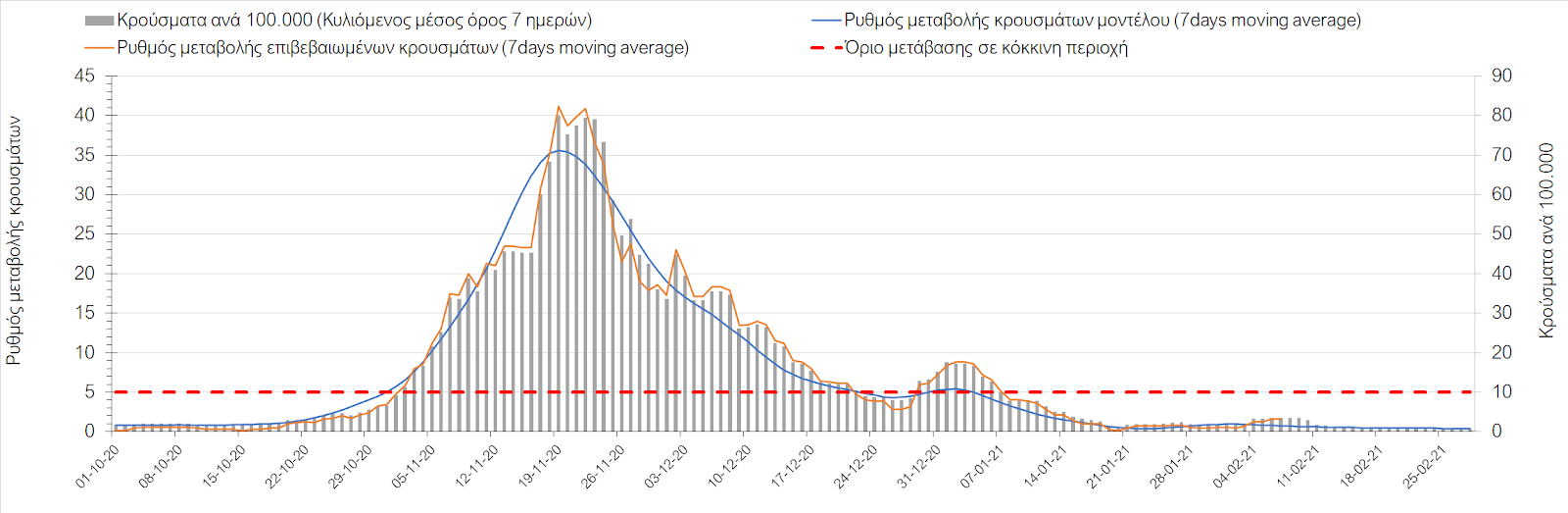 Όπως φαίνεται από το διάγραμμα, από τις 8 Ιανουαρίου έχουμε μια αύξηση κρουσμάτων μέχρι τις 11 Ιανουαρίου η οποία οφείλεται στη μείωση της περιστολής που σημειώθηκε στις γιορτές. Από τις 11 μέχρι τις 18 Ιανουαρίου προβλεπόταν μια μείωση κρουσμάτων λόγω της εφαρμογής του lockdown και η οποία όντως παρατηρήθηκε. Εντούτοις, όπως είχαμε προβλέψει, από τις 23 Ιανουαρίου και έπειτα διαφαίνεται αύξηση στον κυλιόμενο μέσο όρο των κρουσμάτων. Η εφαρμογή των περιοριστικών μέτρων, σε συνδυασμό με την επικρατούσα μετεωρολογία πρόκειται να επιφέρει μια σταθεροποίηση ή και ελαφρά μείωση των κρουσμάτων τις επόμενες ημέρες. Παρ’ολ’αυτά, μετά από τις 17/2 προβλέπεται μια περαιτέρω αύξηση των κρουσμάτων.