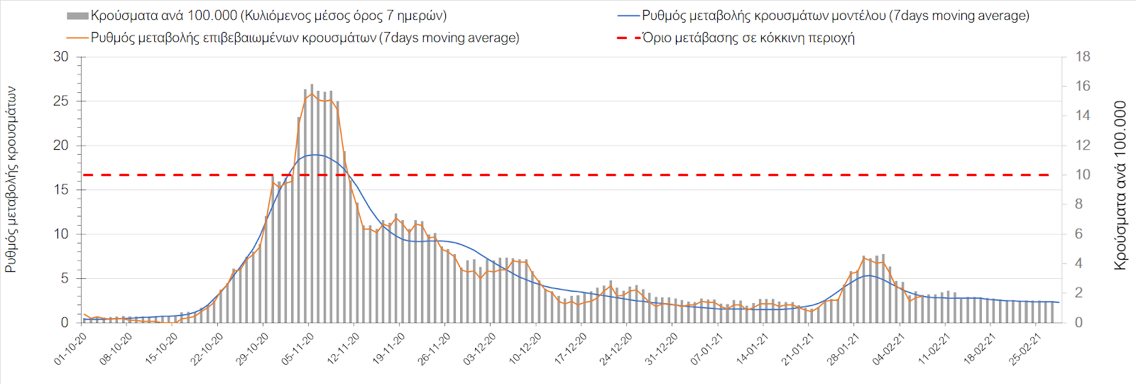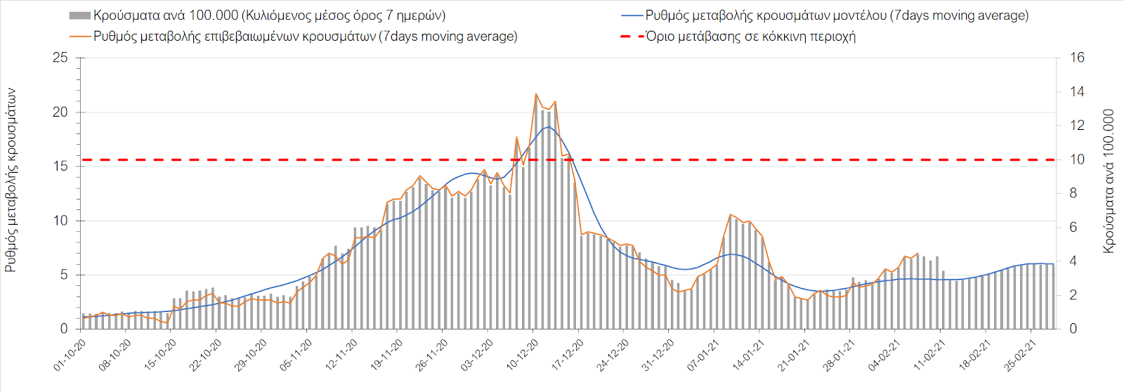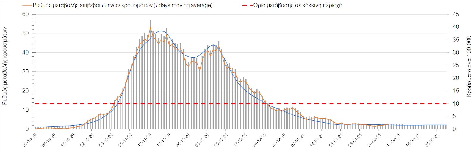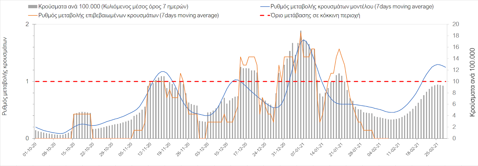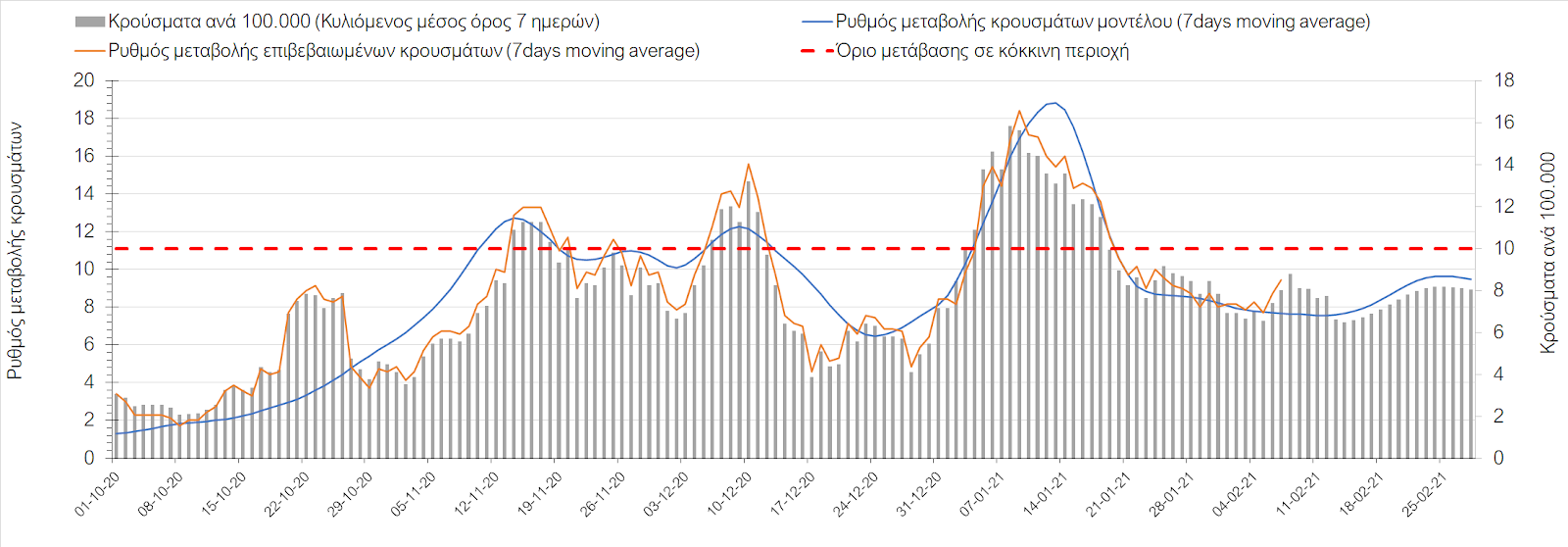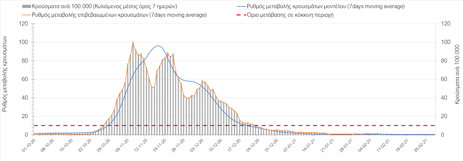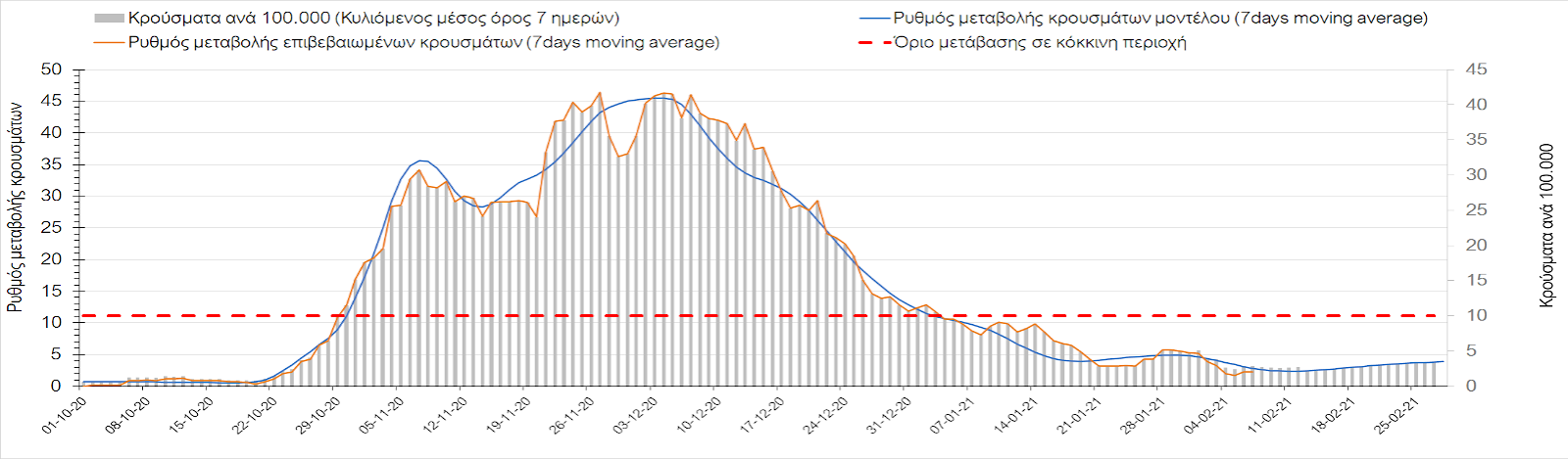 Όπως φαίνεται από το διάγραμμα, από τις 8 Ιανουαρίου έχουμε μια αύξηση κρουσμάτων μέχρι τις 11 Ιανουαρίου η οποία οφείλεται στη μείωση της περιστολής που σημειώθηκε στις γιορτές. Από τις 11 μέχρι τις 18 Ιανουαρίου προβλεπόταν μια μείωση κρουσμάτων λόγω της εφαρμογής του lockdown και η οποία όντως παρατηρήθηκε. Εντούτοις, όπως είχαμε προβλέψει, από τις 23 Ιανουαρίου και έπειτα διαφαίνεται αύξηση στον κυλιόμενο μέσο όρο των κρουσμάτων. Η εφαρμογή των περιοριστικών μέτρων, σε συνδυασμό με την επικρατούσα μετεωρολογία πρόκειται να επιφέρει μια σταθεροποίηση ή και ελαφρά μείωση των κρουσμάτων τις επόμενες ημέρες. Παρ’ολ’αυτά, μετά από τις 17/2 προβλέπεται μια περαιτέρω αύξηση των κρουσμάτων.