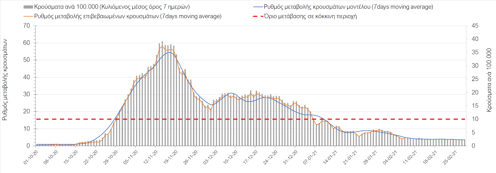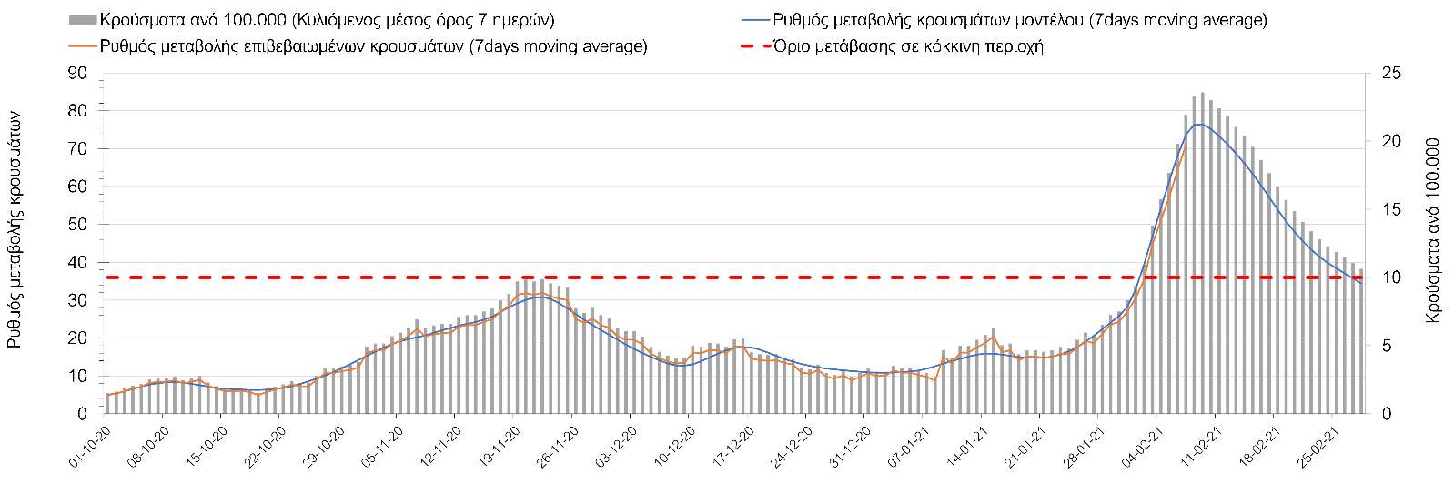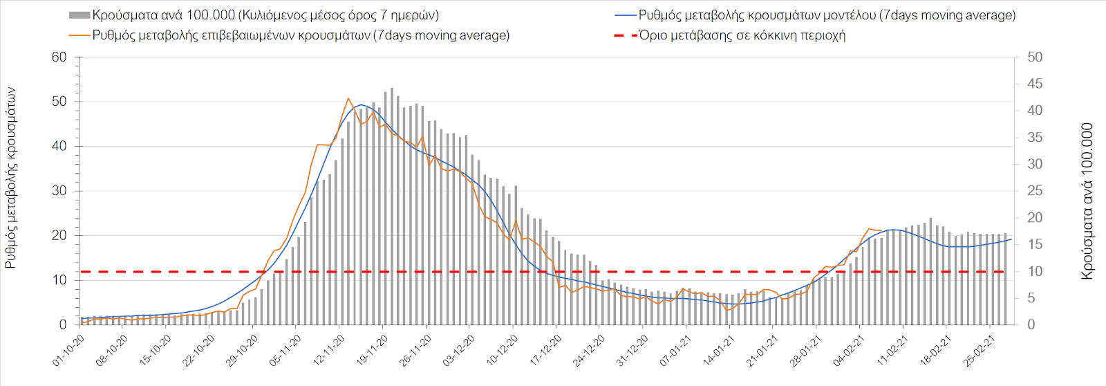 Η αποκλιμάκωση που παρατηρείται στον αριθμό των ασθενών σε κρίσιμη κατάσταση (διασωληνομένοι σε ΜΕΘ), καθώς και ο αριθμός των θανάτων συνάδουν που παρατηρήθηκαν σήμερα συνάδουν με τις προσομοιώσεις του μοντέλου CORE για τον επόμενο μήνα, ενώ πλέον και ο αριθμός των νέων κρουσμάτων παραμένει ανησυχητικός, ιδιαίτερα για την Αττική. Τα παραπάνω αποτελέσματα αποτυπώνονται και στο δείκτη θετικότητας (παρά τον μεγάλο αριθμό τεστ ανίχνευσης που πραγματοποιήθηκε). Σε πανελλαδικό επίπεδο ο κυλιόμενος εβδομαδιαίος μέσος όρος του δείκτη θετικότητας μειώθηκε στο 3,1% (η ημερήσια τιμή σήμερα είναι 3,3%) ενώ ο κυλιόμενος εβδομαδιαίος μέσος όρος του πραγματικού αριθμού αναπαραγωγής Rt (δηλαδή ο αριθμός των ατόμων που ένας φορέας μπορεί να επιμολύνει) είναι πλέον 1,35 (τιμές του Rt πάνω από τη μονάδα υποδηλώνουν καθαρή αύξηση της διασποράς του ιού στην κοινότητα). Οι τιμές αυτές δείχνουν ότι αν και καλώς εφαρμόσθηκε το γενικευμένο lockdown της 3ης Ιανουαρίου, έτσι ώστε να αποσβεσθούν όποιες αποκλίσεις στην εφαρμογή των μέτρων υπήρξαν κατά την περίοδο των εορτών, δημιουργώντας θετικές προοπτικές στο σταδιακό άνοιγμα της οικονομίας που ξεκίνησε από τη Δευτέρα 18 Ιανουαρίου, ιδιαίτερη προσοχή πρέπει να δοθεί διότι όπως είχαμε επισημάνει από το προηγούμενο Σαββατοκύριακο, τα αποτελέσματα των τελευταίων ημερών, δείχνουν ότι σε πανελλαδικό επίπεδο υπάρχει συνολικά αύξηση, δημιουργώντας ανησυχία τόσο για την πορεία της πανδημίας, όσο και για την πραγματική εξάπλωση του στελέχους B.1.1.7. του SARS-CoV-2 στην κοινότητα. Αναμένουμε λοιπόν τα αποτελέσματα των επομένων ημερών, όπου ο αριθμός των τεστ ανίχνευσης θα παραμείνει στα συνήθη επίπεδα (άνω των 30.000 ανά ημέρα), και ελπίζουμε να συνεχίσει στα επίπεδα των τελευταίων ημερών, δηλαδή άνω των 45.000, και να συνεχίσει να αυξάνει άμεσα, φτάνοντας τα 80.000-100.000 τεστ ημερησίως. Επιπλέον, με βάση τα δεδομένα αυτής της εβδομάδας, καλώς εφαρμόσθηκαν τα περιοριστικά μέτρα που ισχύουν από τις 6 Φεβρουαρίου, τα οποία ίσως χρειαστούν επιπλέον αναθεώρηση, με βάση την επιδημιολογική εικόνα που θα επικρατήσει. Με τα μέχρι τώρα δεδομένα, φαίνονται να είναι ικανά να αναχαιτίσουν προσωρινά την επέλαση ενός τρίτου κύματος, εν αναμονή και επιπλέον στοιχείων για τη μεταδοτικότητα του στελέχους B.1.1.7. του SARS-CoV-2, όσο και της διασποράς του στην κοινότητα.