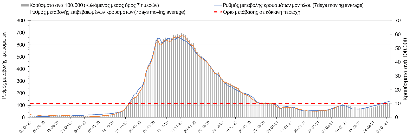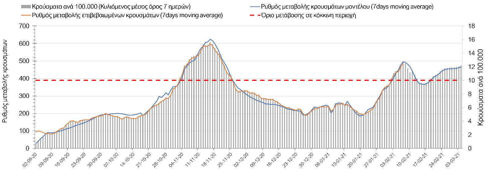 Σχήμα 3. Πορεία του ημερησίου αριθμού των κρουσμάτων (κυλιόμενος μέσος όρος 7 ημερών) στην Ελληνική επικράτεια