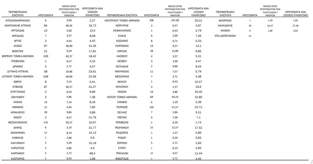 Έτσι βάσει της κατανομής των 1.515 νέων εγχώριων κρουσμάτων ανά Περιφερειακή Ενότητα, στην Αττική καταγράφεται σχεδόν το 50% των κρουσμάτων. Συγκεκριμένα, 750 νέα κρούσματα εντοπίστηκαν στο λεκανοπέδιο, ενώ υψηλά είναι τα νούμερα σε Θεσσαλονίκη, Αχαΐα και Εύβοια.