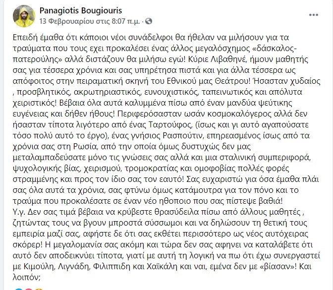 Σημειώνεται πως ο Παναγιώτης Μπουγιούρης σε ανάρτησή του στα social media είχε καταγγείλει μεταξύ άλλων: “Επειδή έμαθα ότι κάποιοι νέοι συνάδελφοι θα ήθελαν να μιλήσουν για τα τραύματα που τους έχει προκαλέσει ένας άλλος μεγαλόσχημος «δάσκαλος-πατερούλης» αλλά διστάζουν θα μιλήσω εγώ! Κύριε Λιβαθινέ, ήμουν μαθητής σας για τέσσερα χρόνια και σας υπηρέτησα πιστά και για άλλα τέσσερα ως απόφοιτος στην πειραματική σκηνή του Εθνικού μας Θεάτρου! Ήσασταν χυδαίος , προσβλητικός, ακρωτηριαστικός, ευνουχιστικός, ταπεινωτικός και απόλυτα χειριστικός! Βέβαια όλα αυτά καλυμμένα πίσω από έναν μανδύα ψεύτικης ευγένειας και δήθεν ήθους! Περιφερόσασταν ωσάν κοσμοκαλόγερος αλλά δεν ήσασταν τίποτα λιγότερο από ένας Ταρτούφος, (ίσως και γι αυτό αγαπούσατε τόσο πολύ αυτό το έργο), ένας γνήσιος Ρασπούτιν, επηρεασμένος ίσως από τα χρόνια σας στη Ρωσία, από την οποία όμως δυστυχώς δεν μας μεταλαμπαδεύσατε μόνο τις γνώσεις σας αλλά και μια σταλινική συμπεριφορά, ψυχολογικής βίας, χειρισμού, τρομοκρατίας και ομοφοβίας πολλές φορές στραμμένης και προς τον ίδιο σας τον εαυτό! Σας ευχαριστώ για όσα έμαθα πλάι σας όλα αυτά τα χρόνια, σας φτύνω όμως κατάμουτρα για τον πόνο και το τραύμα που προκαλέσατε σε έναν νέο ηθοποιό που σας πίστεψε βαθιά!”.