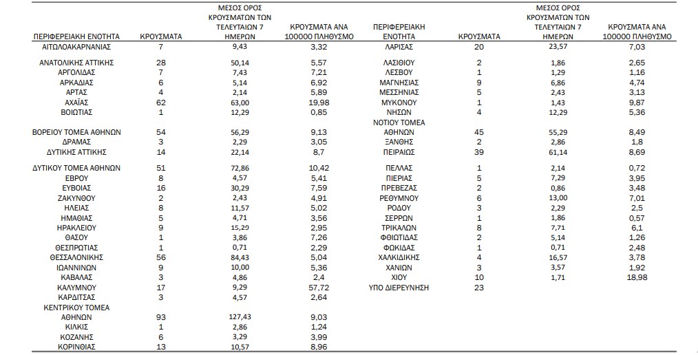 Ο ΕΟΔΥ ανακοίνωσε τη Δευτέρα 698 νέα κρούσματα κορονοϊού. Από αυτά τα 13 είναι εισαγόμενα εκ των οποίων 11 εντοπίστηκαν κατόπιν ελέγχων στις πύλες εισόδου της χώρας. Έτσι βάσει της κατανομής των 685 νέων εγχώριων κρουσμάτων ανά Περιφερειακή Ενότητα, στην Αττική εντοπίστηκαν για ακόμη μία μέρα περίπου τα μισά, 328 στον αριθμό. Στη Θεσσαλονίκη εντοπίστηκαν 56, στην Αχαΐα που έχει μπει σε σκληρό lockdown, 62 νέες κρούσματα , ενώ η Εύβοια είχε 16.