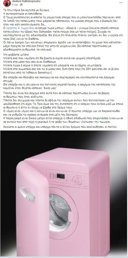 Με μία ανάρτηση στο facebook ο Αντώνης Καφετζόπουλος καλεί τους συναδέλφους του που έχουν υποστεί οποιαδήποτε μορφή βίας, να βγουν και να μιλήσουν χωρίς να φοβάται. Παράλληλα, αφήνει υπαινιγμούς κατά του Κώστα Γεωργουσόπουλου και του Χρήστου Χωμενίδη, ενώ συνοδεύει την ανάρτησή του με μία φωτογραφία πλυντηρίου για όσους θέλουν να ξεπλύνουν όσους καταγγέλλονται για τη συμπεριφορά τους στον χώρο του θεάτρου.