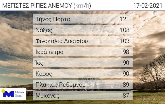 Παράλληλα, επικράτησαν θυελλώδεις βόρειοι άνεμοι με ριπές άνω των 100 χλμ/ώρα, οι οποίοι στη συνέχεια παρουσίασαν μικρή εξασθένηση. Η ισχυρότερη ριπή καταγράφηκε στο Πόρτο Τήνου και ήταν ίση με 121 χλμ/ώρα.