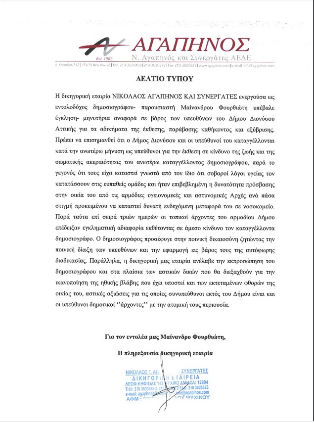 Μηνυτήρια αναφορά υπέβαλε μέσω του πληρεξούσιου δικηγόρου του Νικολάου Αγαπηνού ο παρουσιαστής Μένιος Φουρθιώτης σε βάρος του Δήμου Διονύσου. Σύμφωνα με τη δικηγορική εταιρεία Νικόλαος Αγαπηνός και συνεργάτες, η μήνυση του Μένιου Φουρθιώτη αφορά αδικήματα της έκθεσης, παράβασης καθήκοντος και εξύβρισης.