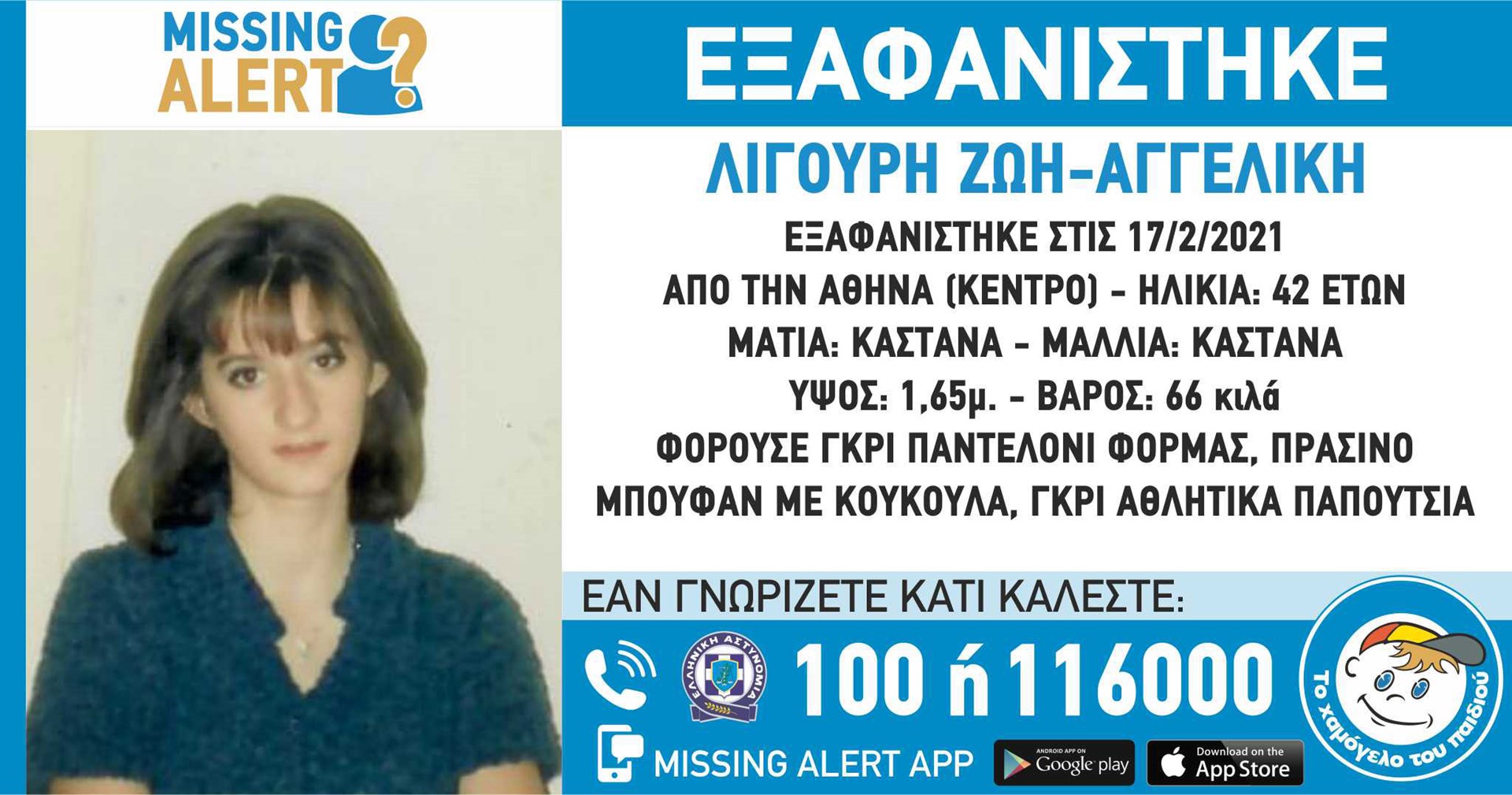 Αγωνία επικρατεί από την εξαφάνιση της 42χρονης Ζωής από το κέντρο της Αθήνας. Η 42χρονη Ζωή-Αγγελική Λιγούρη έχει εξαφανιστεί εδώ και σχεδόν 24 ώρες και Το Χαμόγελο του Παιδιού εξέδωσε Missing Alert γιατί η ζωή της μπορεί να βρίσκεται σε κίνδυνο.