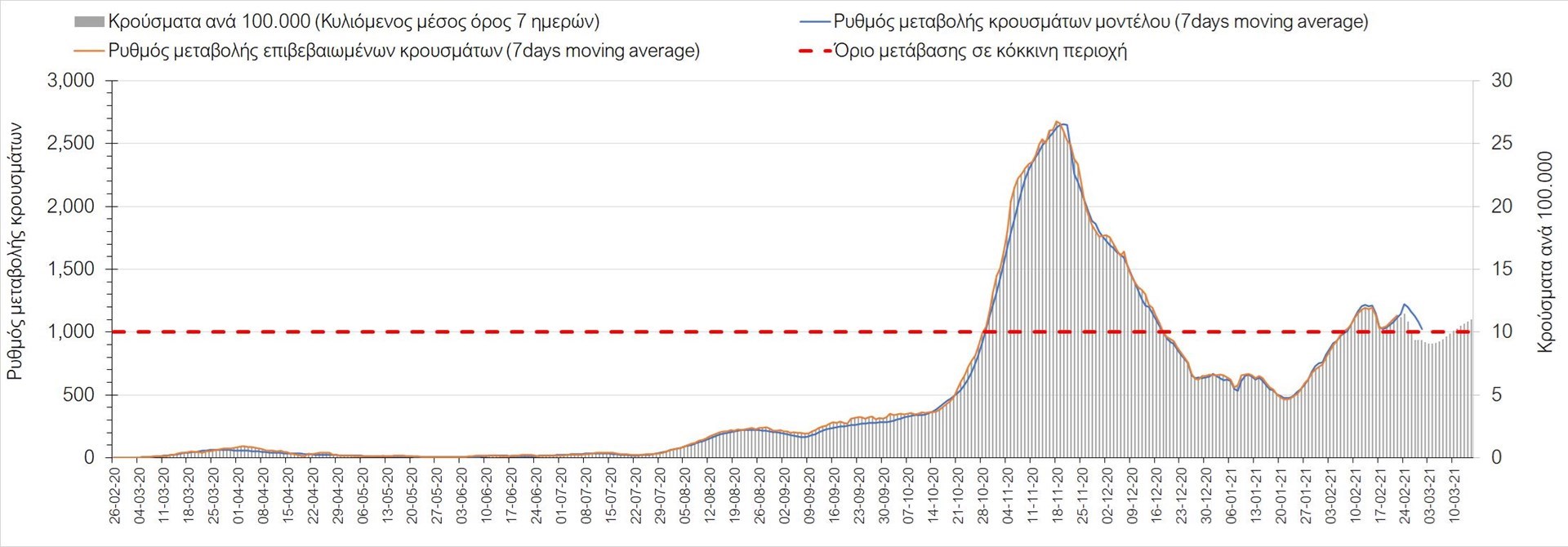 Πορεία του ημερησίου αριθμού των κρουσμάτων (κυλιόμενος μέσος όρος 7 ημερών) στην Ελληνική επικράτεια