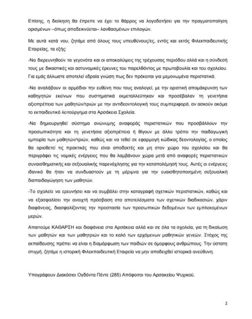 Ως Απόφοιτοι των Αρσακείων Σχολείων καταγγέλλουμε κάθε αρμόδιο καθηγητή/τρια ή υπεύθυνο/η που συγκάλυψε γεγονότα και δεν προστάτευσε, με τις πράξεις ή τις παραλείψεις του, τους μαθητές και τις μαθήτριες. Θέλουμε να γίνει κατανοητό πως δεν αναφερόμαστε σε μεμονωμένα γεγονότα μιας συγκεκριμένης περιόδου, αλλά σε μια διαχρονική νοοτροπία κάποιων· στην παντελή έλλειψη παιδαγωγικών ορίων ορισμένων εκπαιδευτικών, που σε καμία περίπτωση δεν συνάδει με τις πρακτικές ενός προστατευμένου σχολικού περιβάλλοντος.